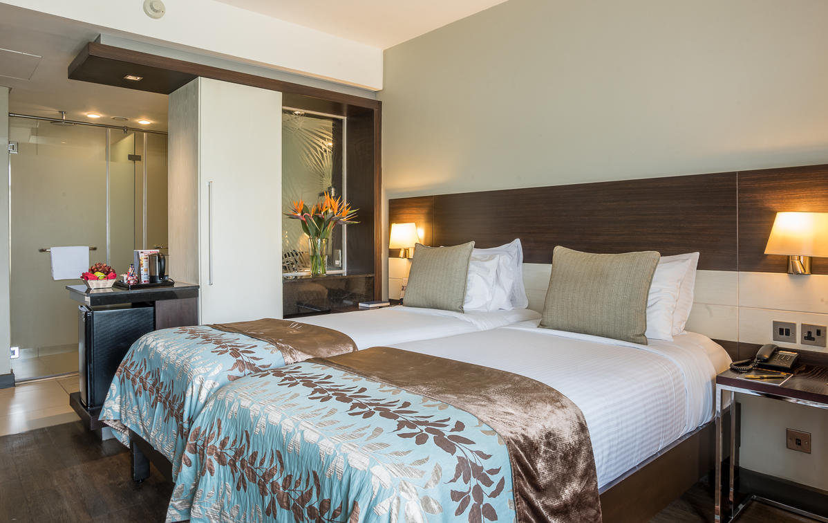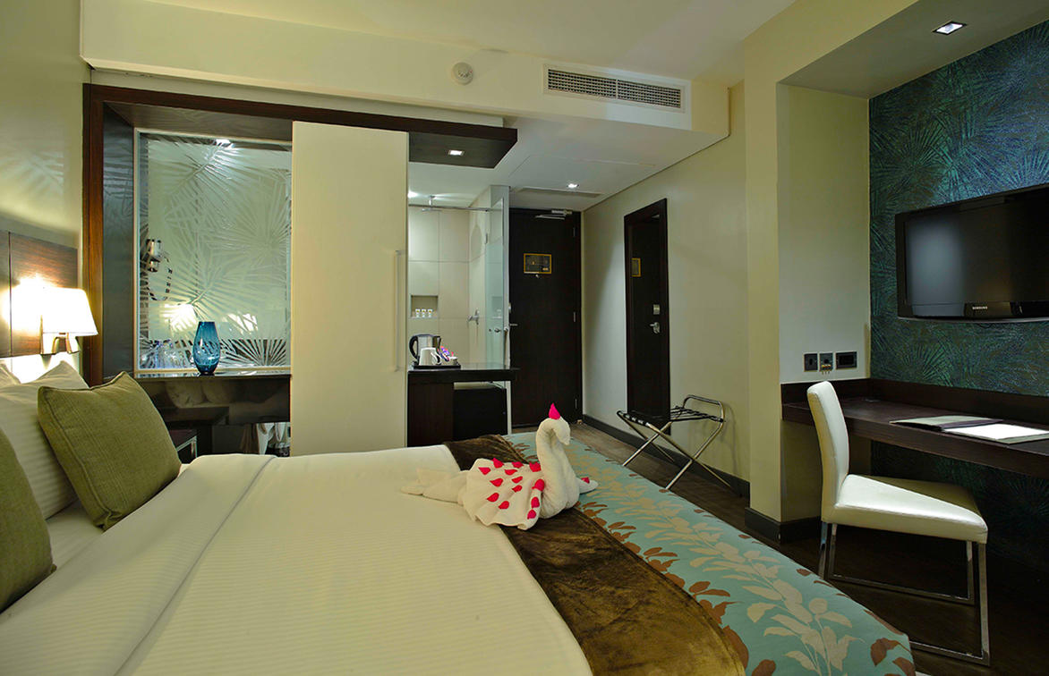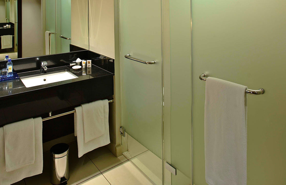 Bathrooms features a toilet and a rain shower separated with a glass-wall.