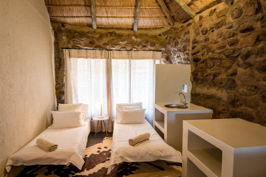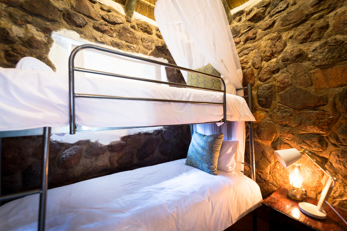 The Grysbok chalet is adjacent to Klipspringer. These room has two separate bedrooms with a large indoor shower and en suite bathroom. The main bedroom is perfect for 2 adults, and the smaller bedroom has bunk beds ideal for 2 children. The view is of the wilderness, pool and main area.