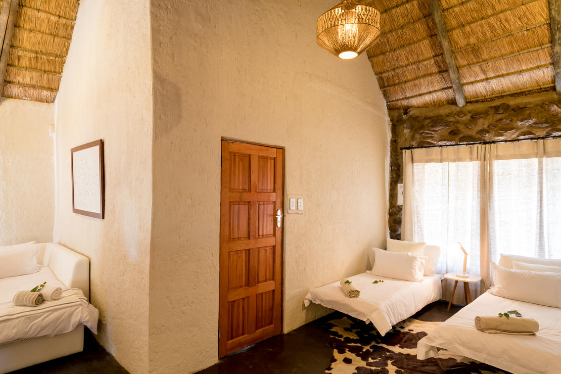 The Klipspringer chalet is the largest chalet and has an outdoor shower with en suite toilet. It sleeps 4 adults or 2 adults and 4 children. The bed configuration comprises a King size bed/converter, sleeper couch and 2 stretcher beds. This room is the first room you will see upon entering the property. The open plan chalet is ideal for family and has a view of the swimming pool, the wilderness and main lodge area in front.