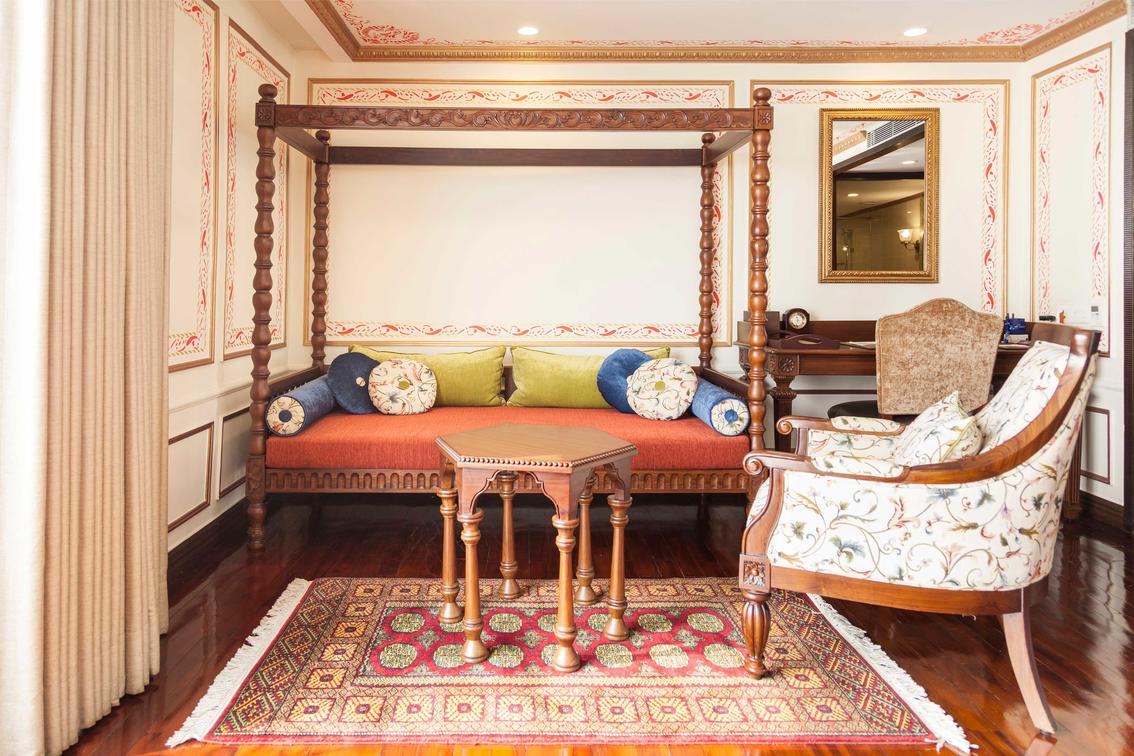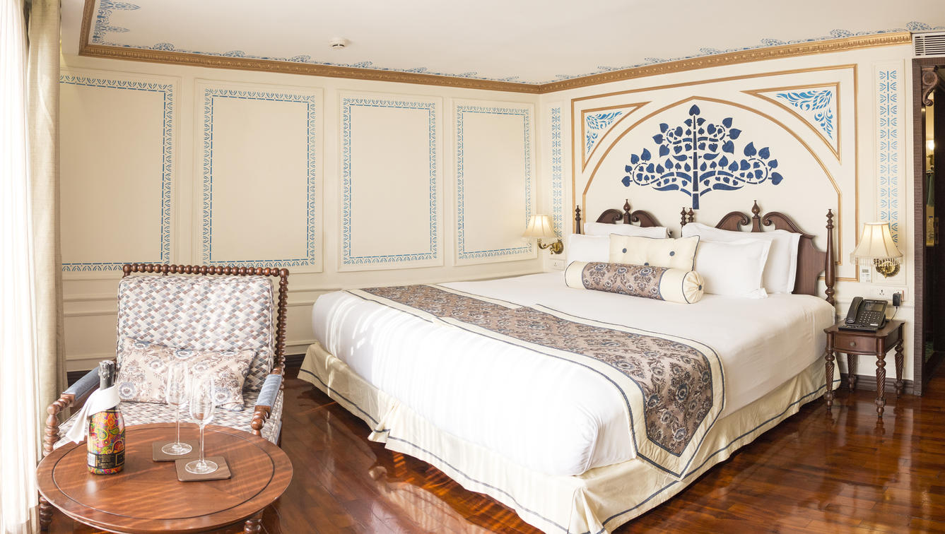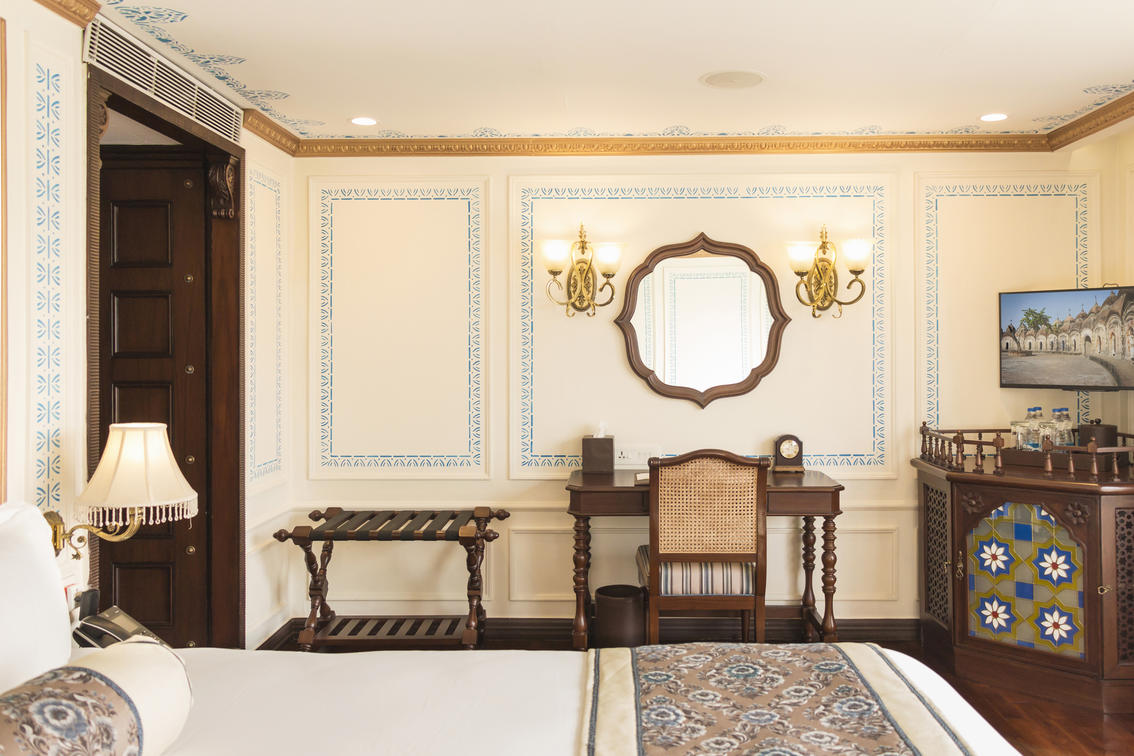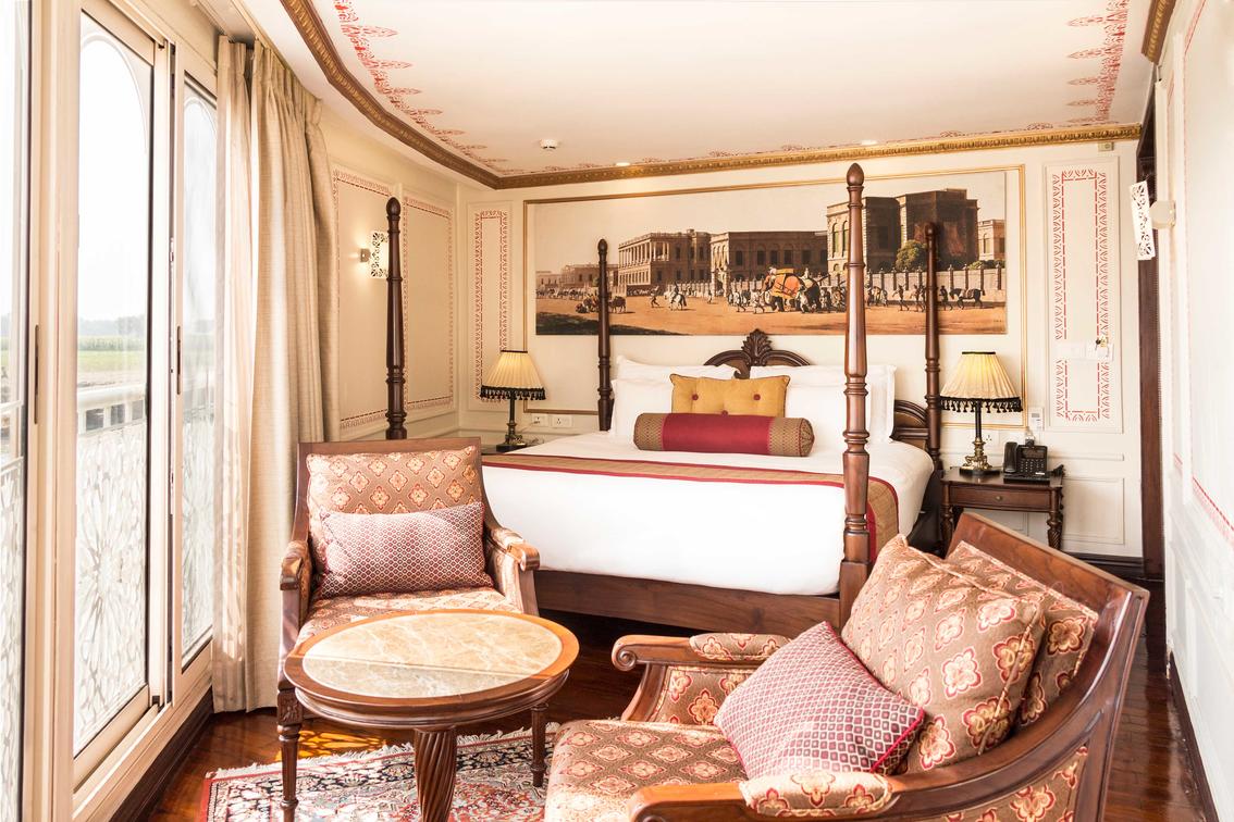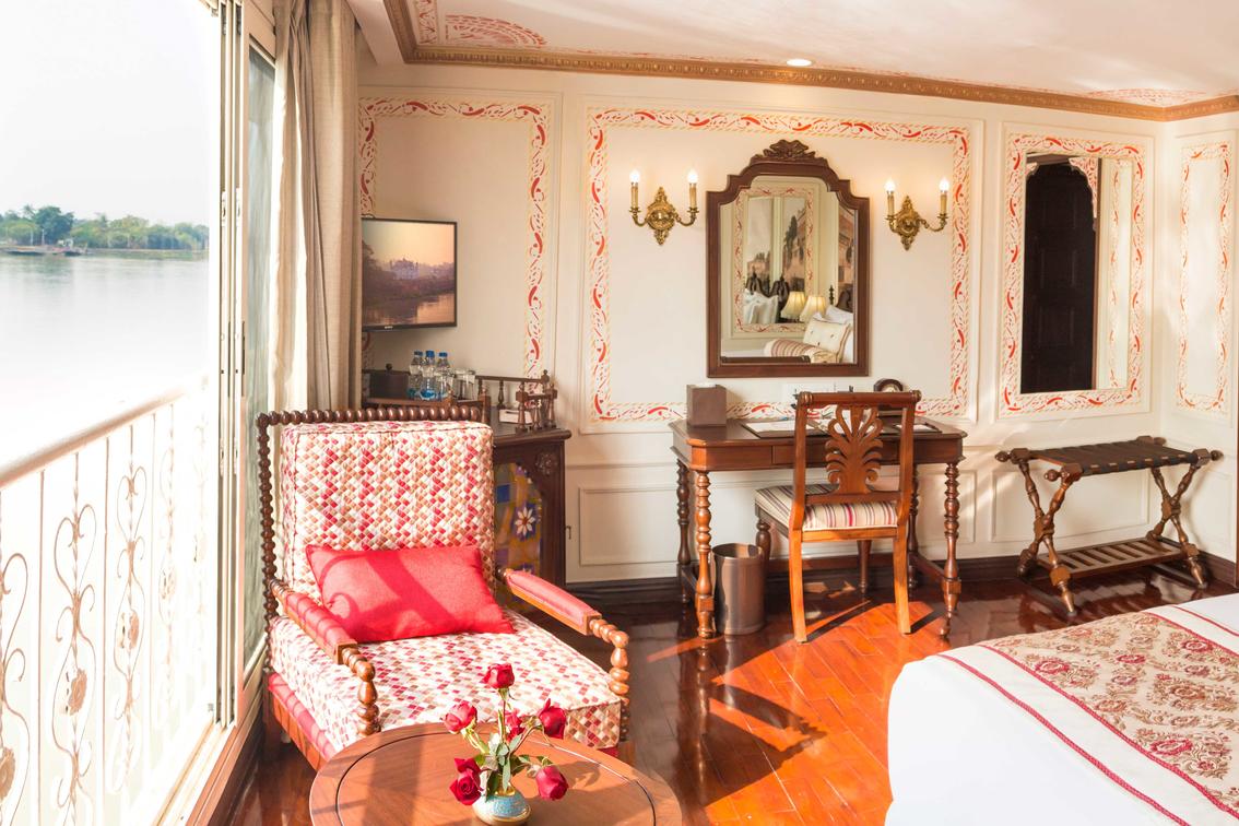 Located mid-ship on the upper deck, the Viceroy Suite offers a regal setting, designed for the most discerning traveller. Furnished in opulent Colonial Indian decor, the Viceroy Suite offers more than 360-square-feet of living space including a finely crafted day bed, Persian rugs, prints of picturesque views of the Ganga, hand-stencilled walls and a spacious bathroom.