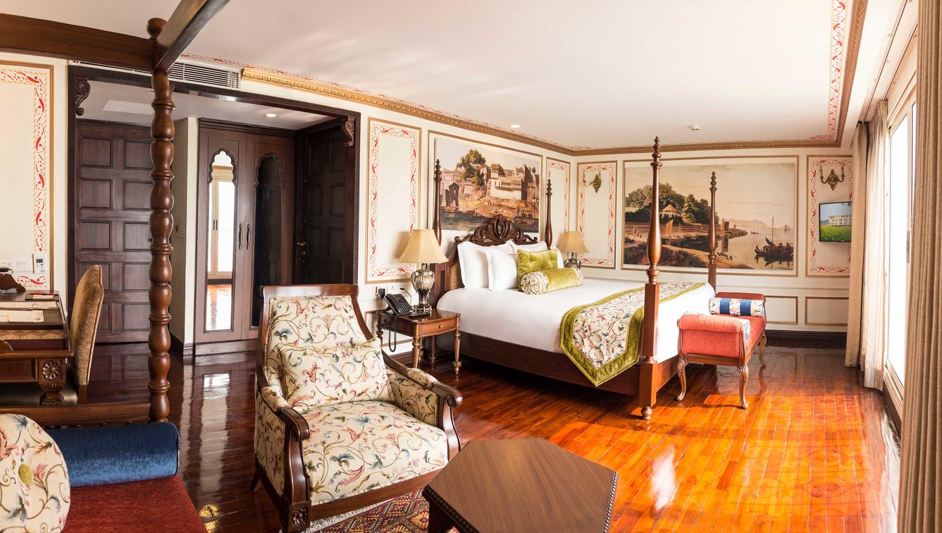 Located forward on the upper deck, the Maharaja Suite is the most luxurious and spacious suite aboard, offering more than 400-square-feet of living space. With only one on board, this truly one-of-a-kind suite hand stencilled walls, Persian rugs, Burma teak floors and colonial prints of picturesque landscapes, monuments and life along the Ganga. Daily butler service and in-room dining are available on request.