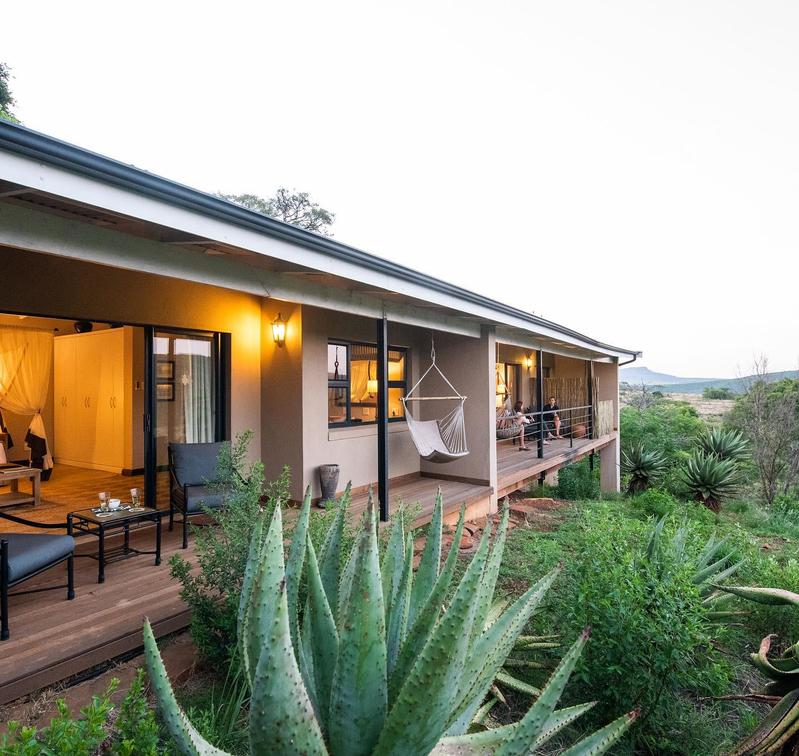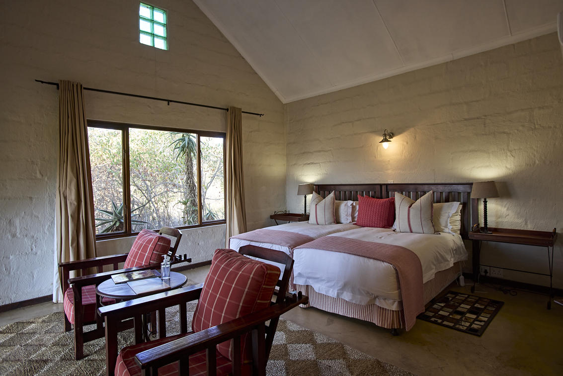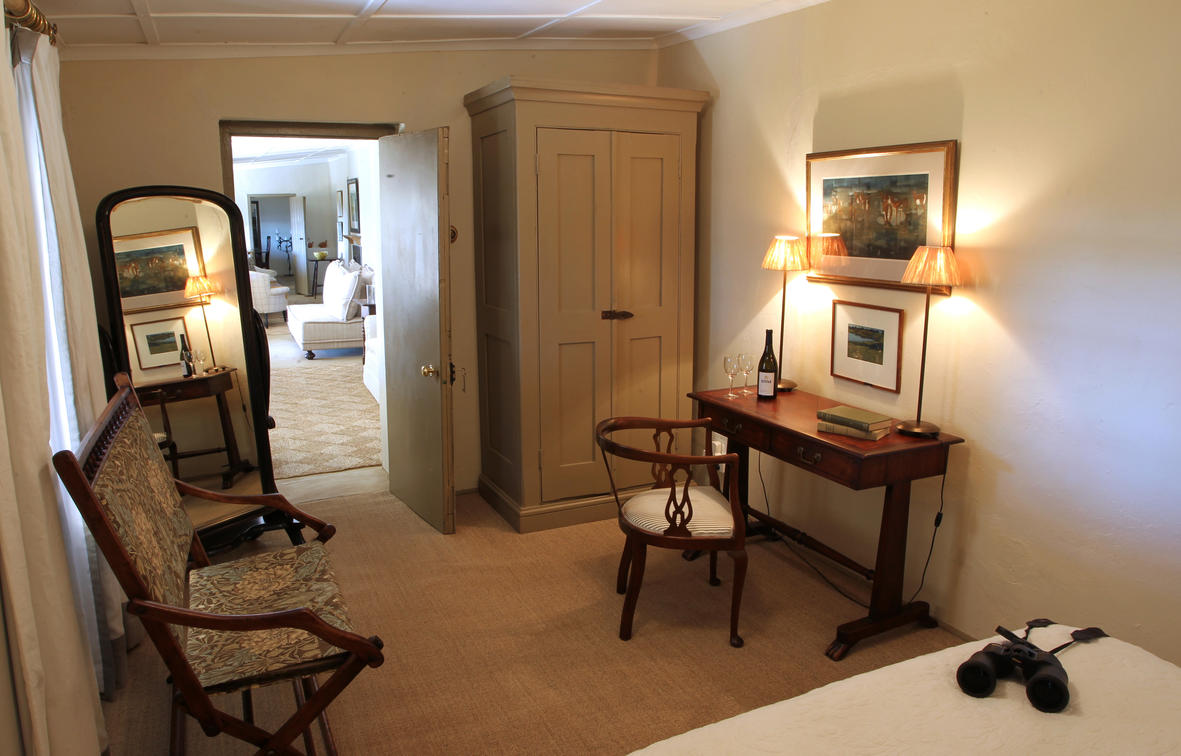 The guest house was once the home of Mr. and Mrs. Potgieter who were immortalized in Gillian Rattray’s award-winning book, 'The Springing of the Year'. This old farmhouse has been altered and now forms the most charming sitting and dining room. The original verandas have been retained and there is a lovely outside eating area. There are 6 superior twin en-suite rooms, all with views of the garden, which has an abundance of bird life in it. We also have two rooms for guides and drivers. The guest house has a large swimming pool; also hosting spectacular views across the plain.