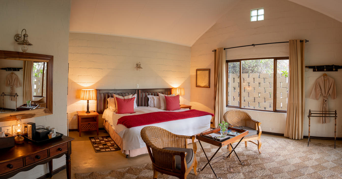 The farmhouse is a charming stone and corrugated iron roof building built in the 1920’s. It was the home of George Buntting, who was an expert on the Anglo-Zulu War. The farmhouse is at the top of the reserve and has a wonderful view of Isandlwana. It has 3 en-suite bedrooms (King, Queen and twin rooms), a sitting room with a fireplace, a dining room, and a kitchen. Although the accommodation is self-catering, you may choose to have some or all meals at the lodge at an additional cost. Should you decide to take this accommodation, you will need to travel to and from the lodge or the guest house for tours and/ or meals (a 5-10 minute drive).