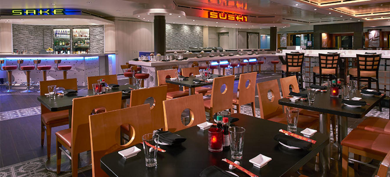 This contemporary sushi and sashimi bar on deck 7 features traditional Japanese culinary bites.