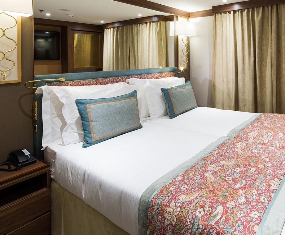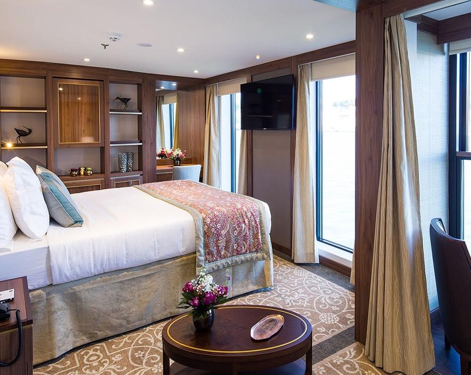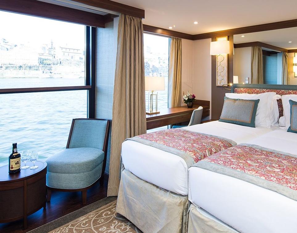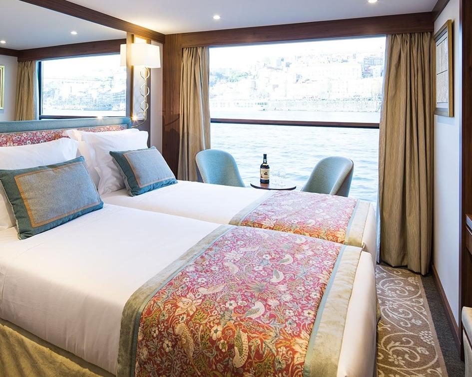 The outside facing cabins are finished to a high standard with superior quality fittings and are amongst the largest on any European river cruise. The beautifully designed marble bathrooms all feature a shower with fully glazed screen, fluffy towels and bathroom cosmetics. The living area features two comfortable chairs, a table, and a small desk. Amenities include individually controlled air-conditioning, a flat-screen high-definition satellite TV, hairdryer, safe, telephone and tea and coffee making facilities. All standard cabins on the upper deck and main deck have full floor to ceiling windows which slide down halfway.