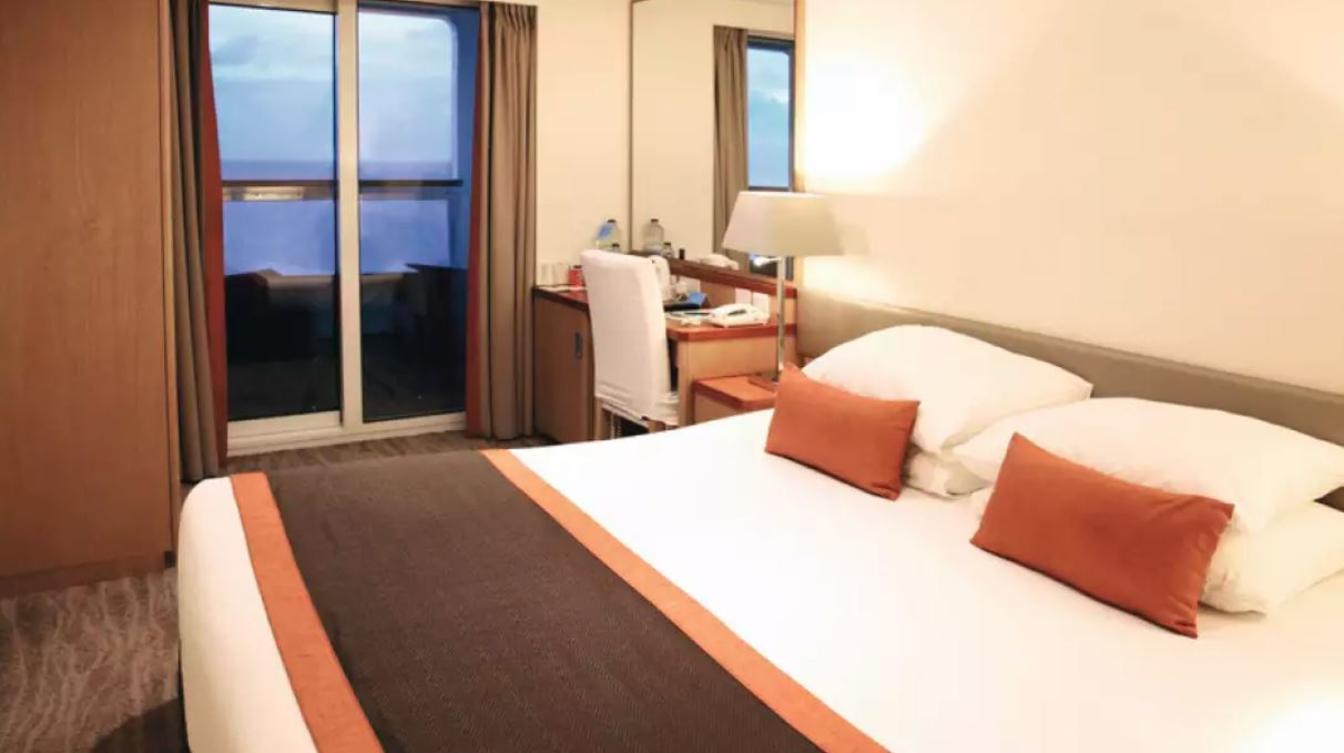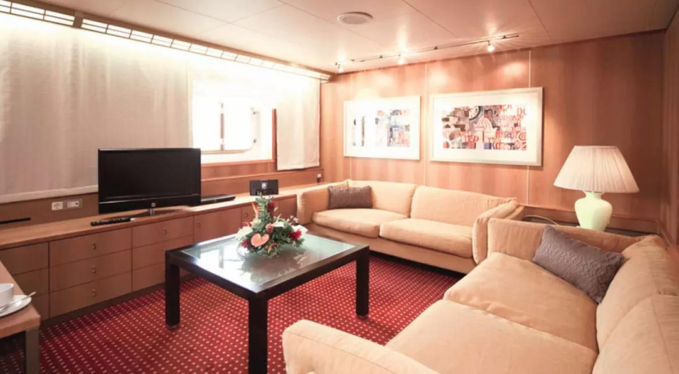 These cabins feature a balcony and dark-wood furniture paired with contemporary wall art and soft fabrics. It also features a living area with a flatscreen TV, two cosy sofas, and a DVD player. Amenities also include a minibar, tea and coffee-making facilities, a walk-in wardrobe, spacious bathroom and whirlpool bath.
