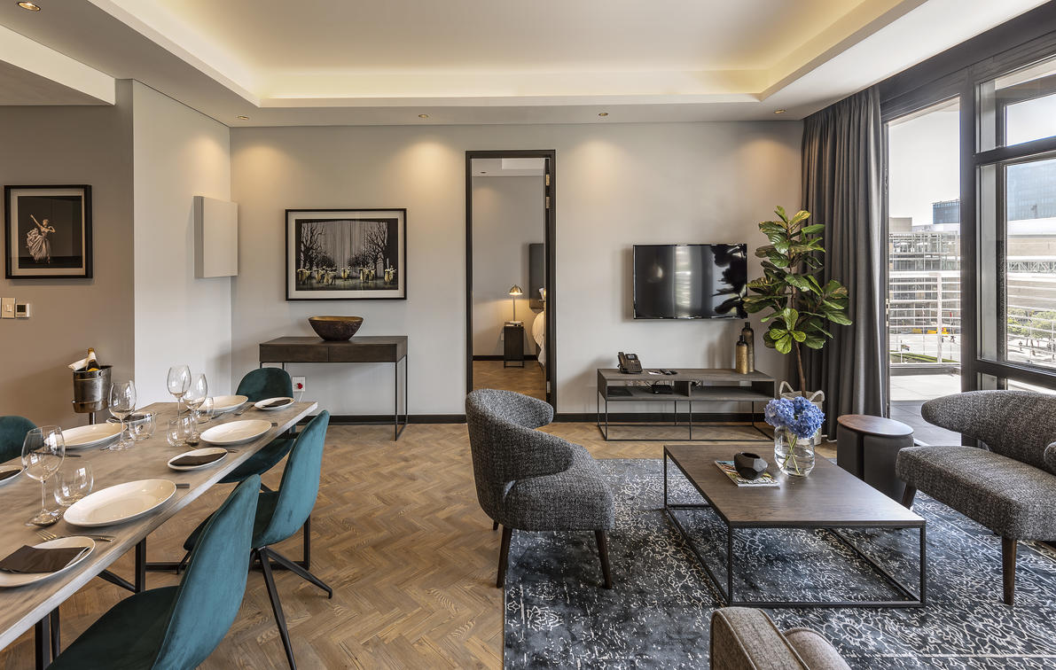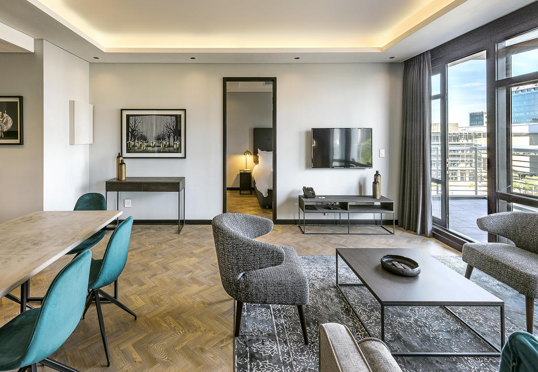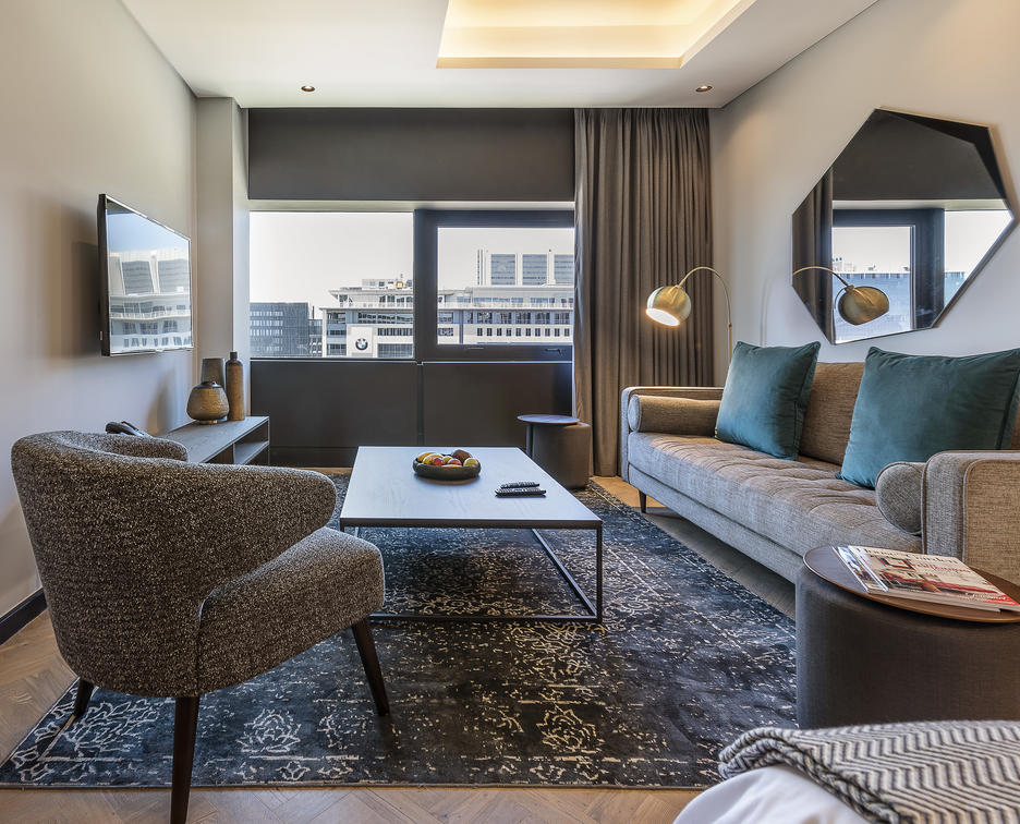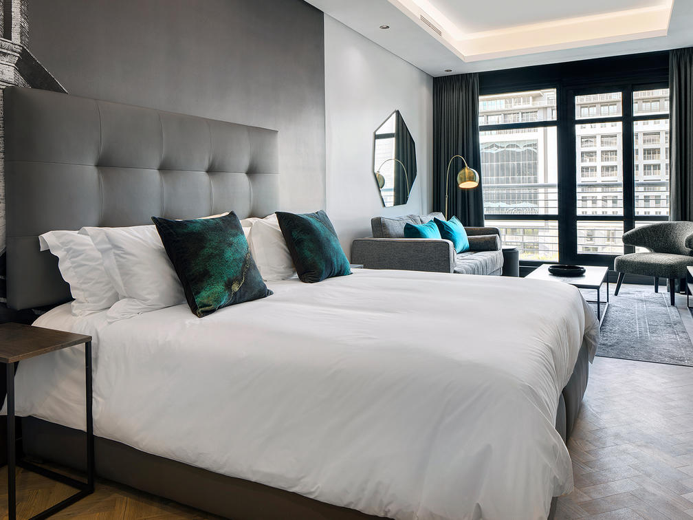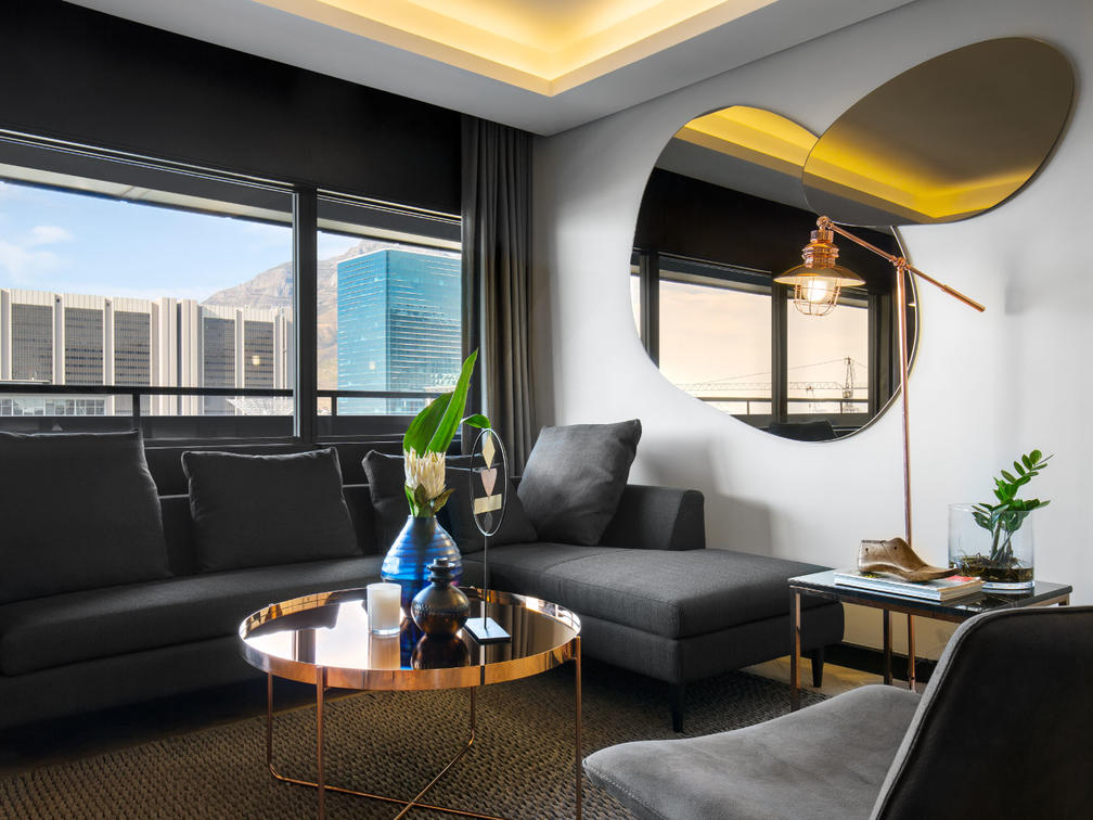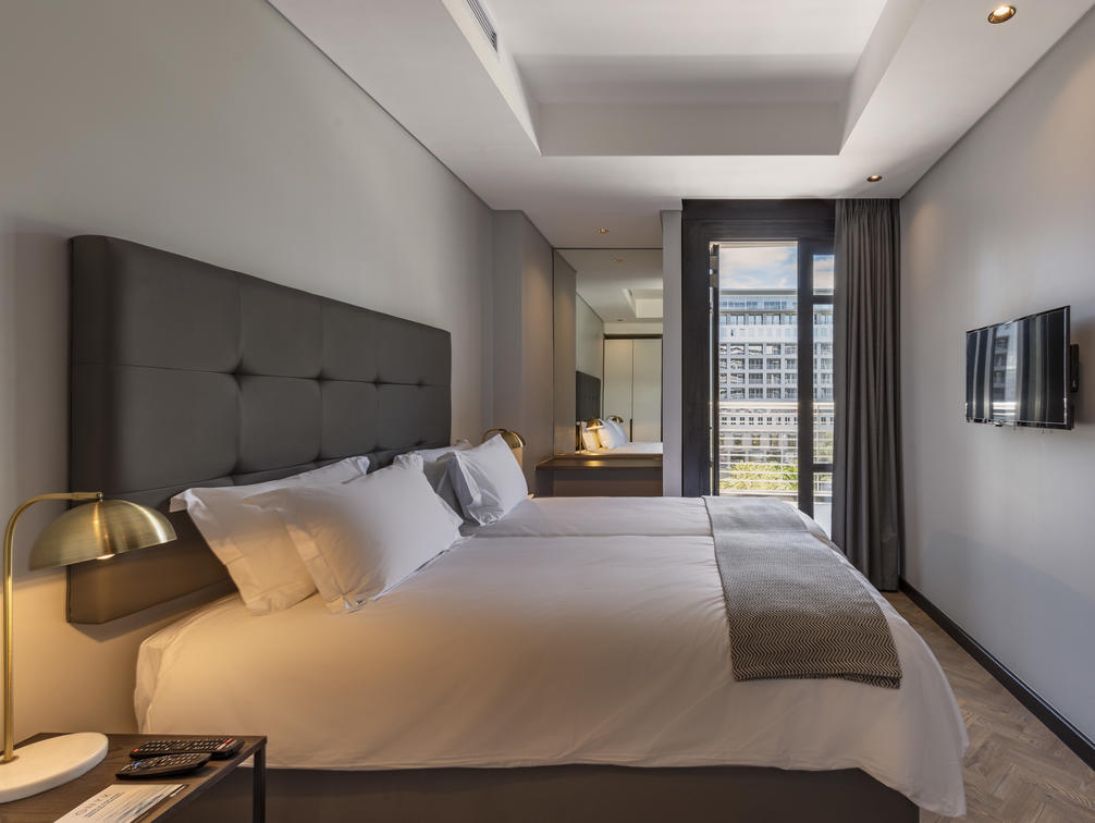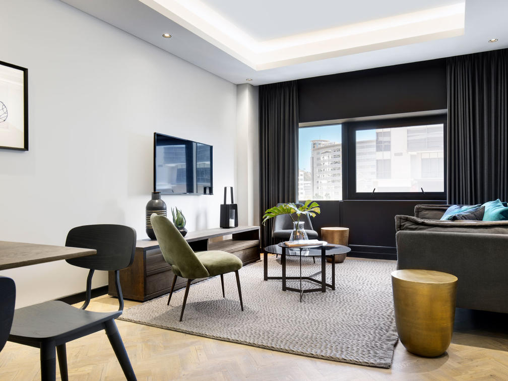 The 16 Deluxe One-Bedroom Apartments are wonderfully spacious, between 77 and 102 m², and offer the privacy of a separate bedroom. They additionally boast stunning views of Cape Town, creating a special atmosphere. Modern elements complement the monochrome colour scheme and create a sense of minimalism.