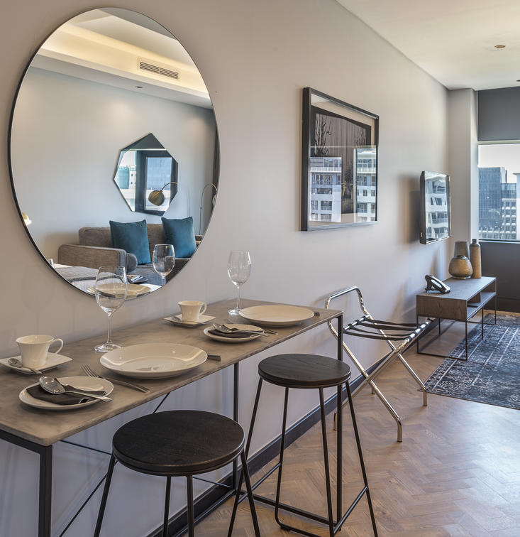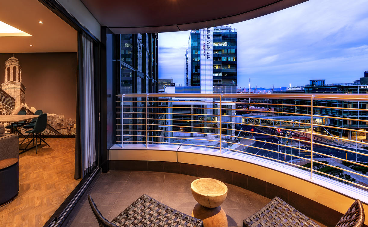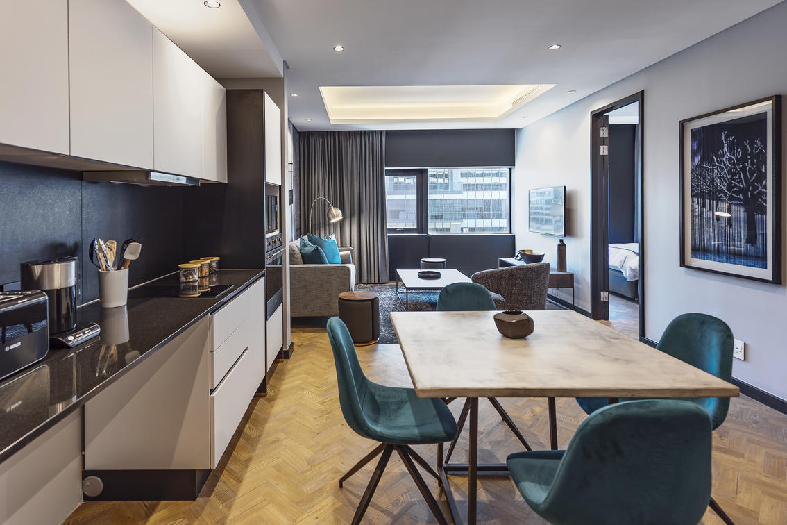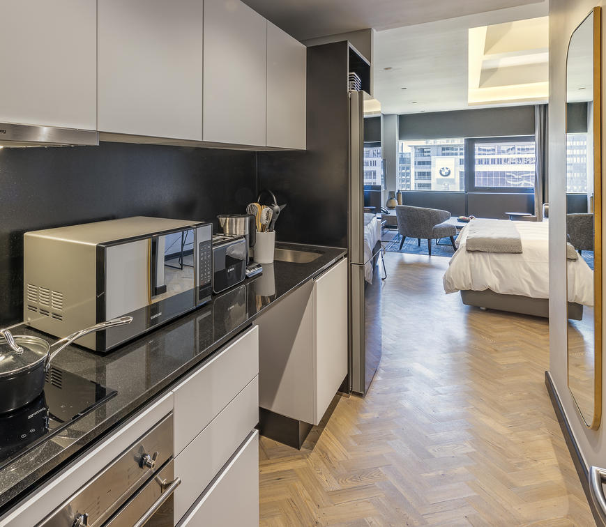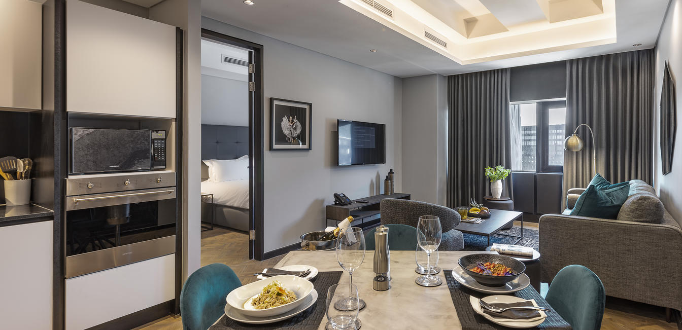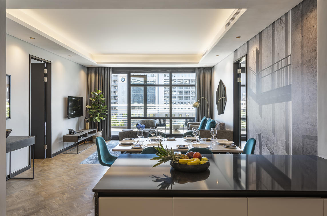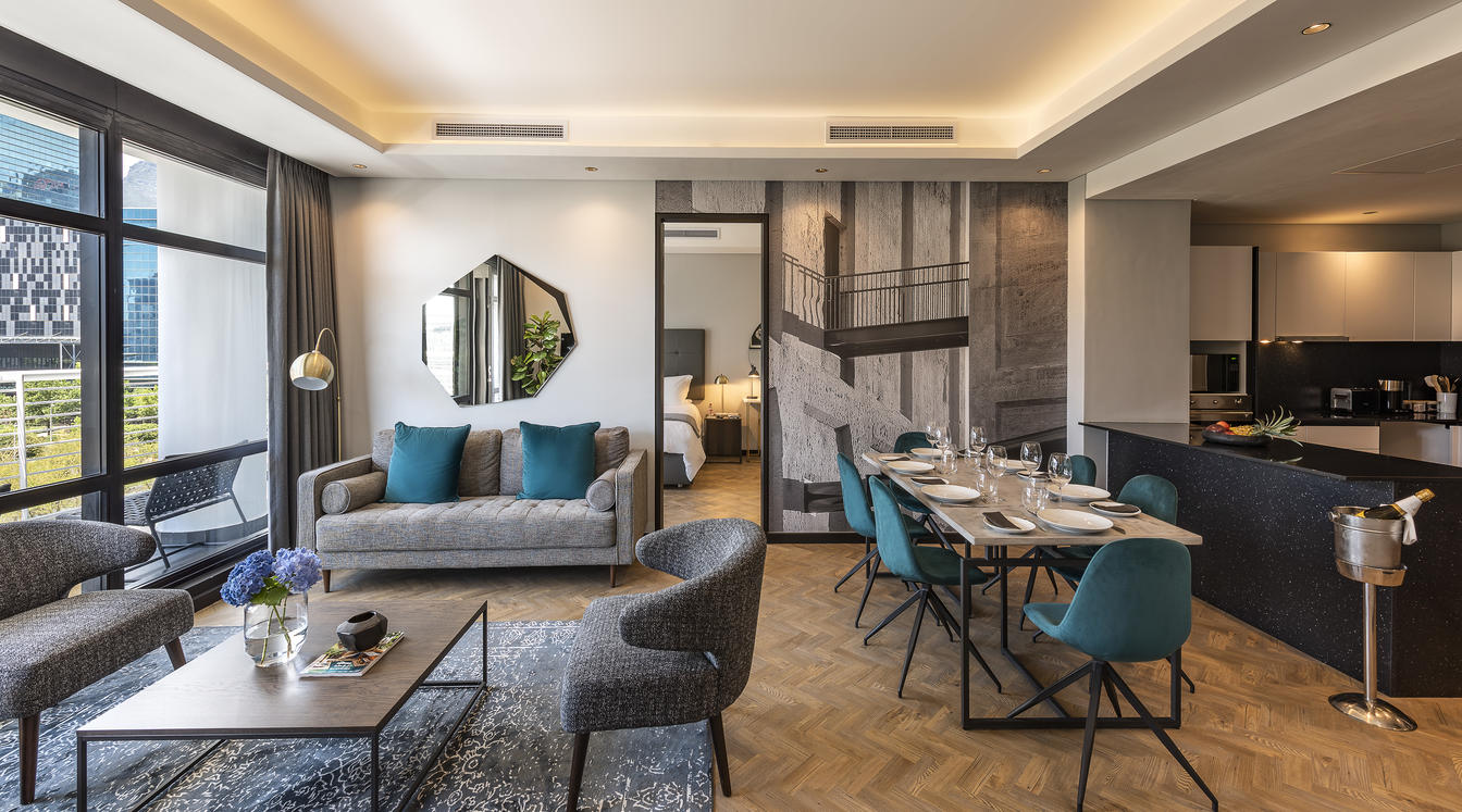 The 16 Deluxe One-Bedroom Apartments are wonderfully spacious, between 77 and 102 m², and offer the privacy of a separate bedroom. They additionally boast stunning views of Cape Town, creating a special atmosphere. Modern elements complement the monochrome colour scheme and create a sense of minimalism.