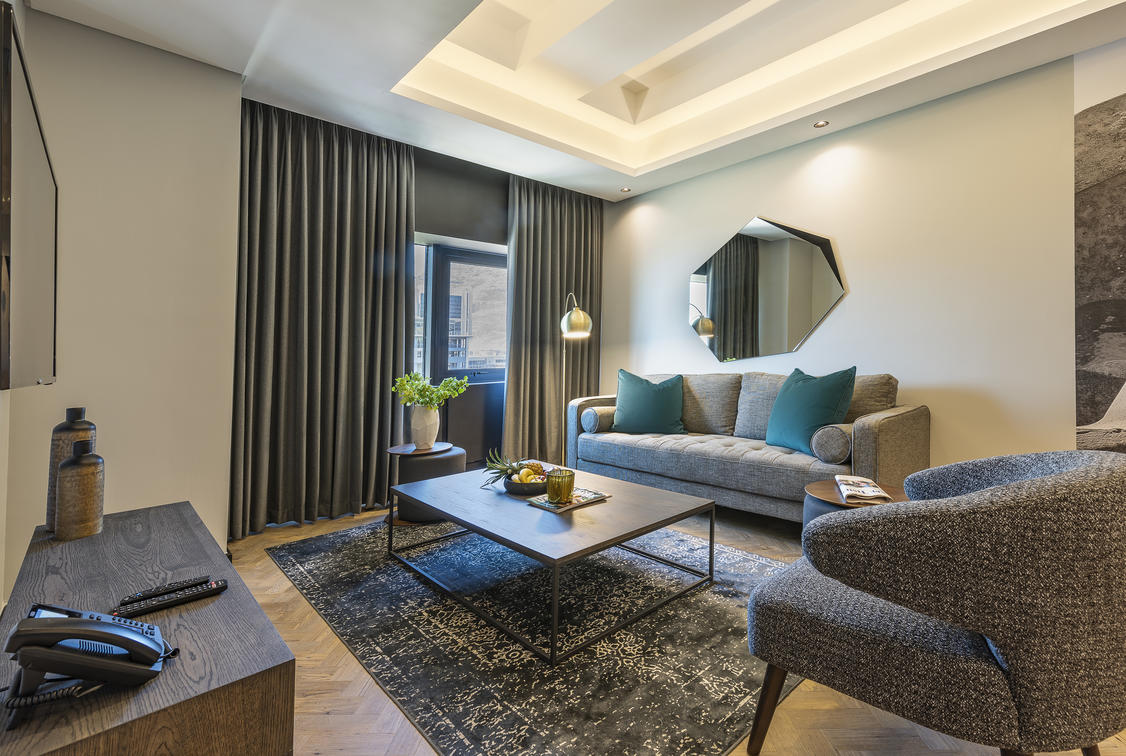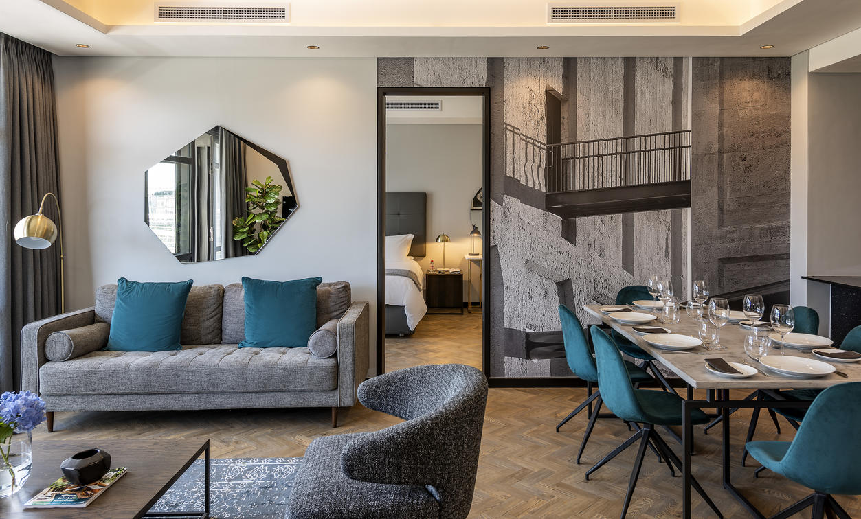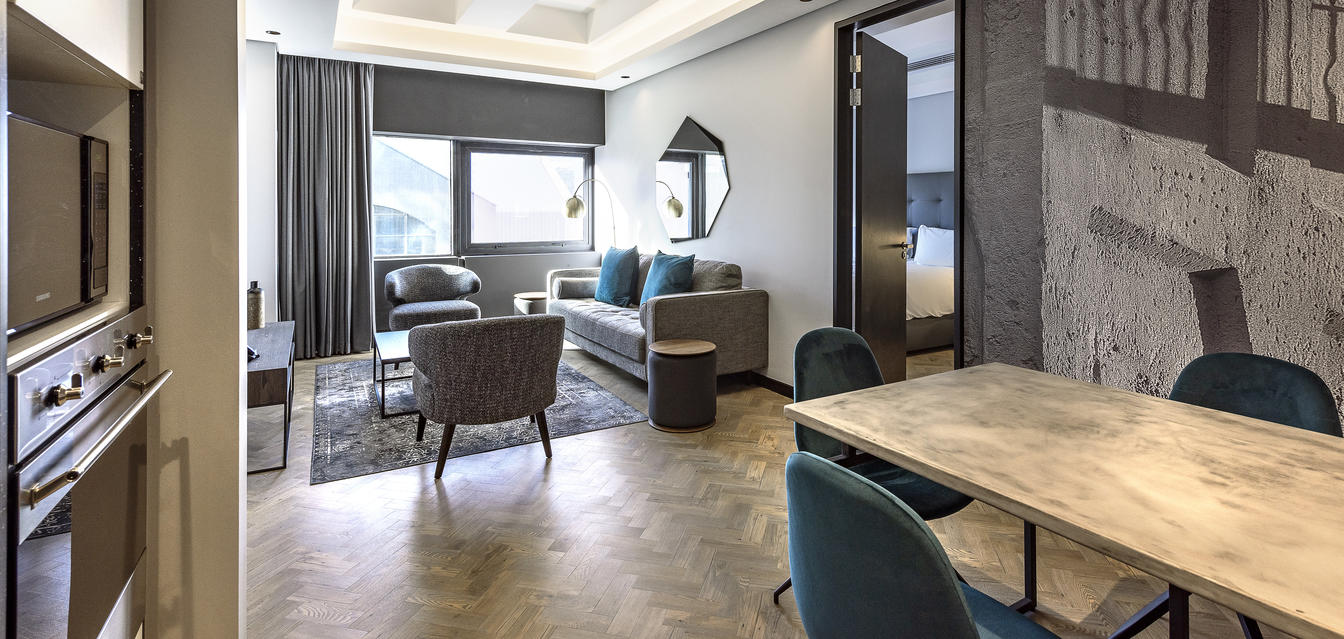 The 5 Deluxe Two-Bedroom Apartments are spacious, measuring between 77 and 102 m². They give a sense of privacy and exclusivity, offering a top-class city experience. These apartments are styled in contrasting shades that create a bold statement and modern atmosphere. The deluxe two-bedroom apartments offer a spacious balcony with breathtaking mountain views.