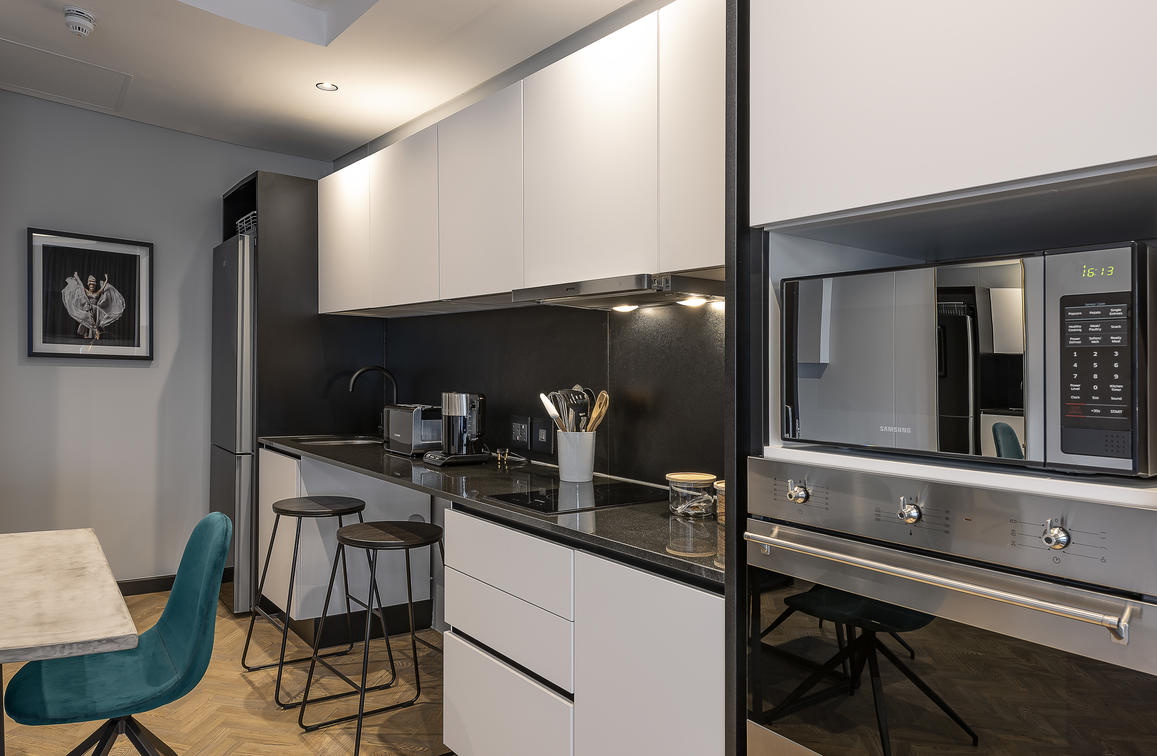 The 8 Two-Bedroom Apartments are generously spacious, measuring between 77 and 102 m². They give a sense of privacy and exclusivity, offering a top-class city experience. Like their counterparts, these apartments are styled in contrasting shades that create a bold statement and modern atmosphere.