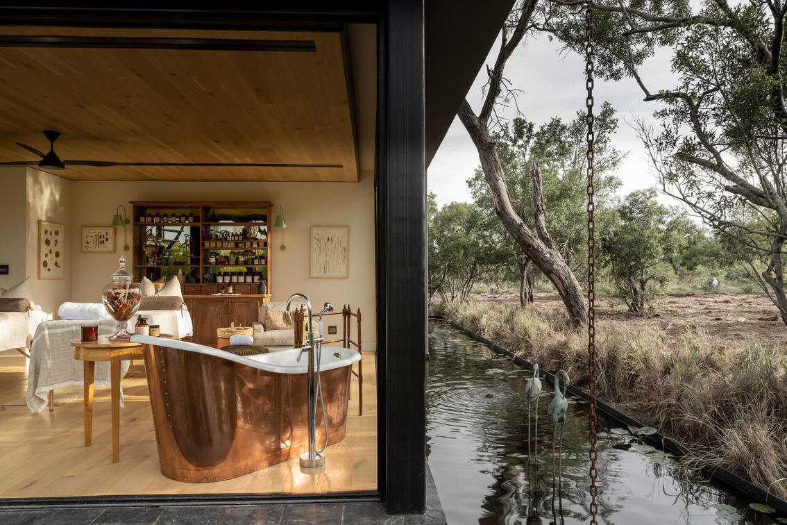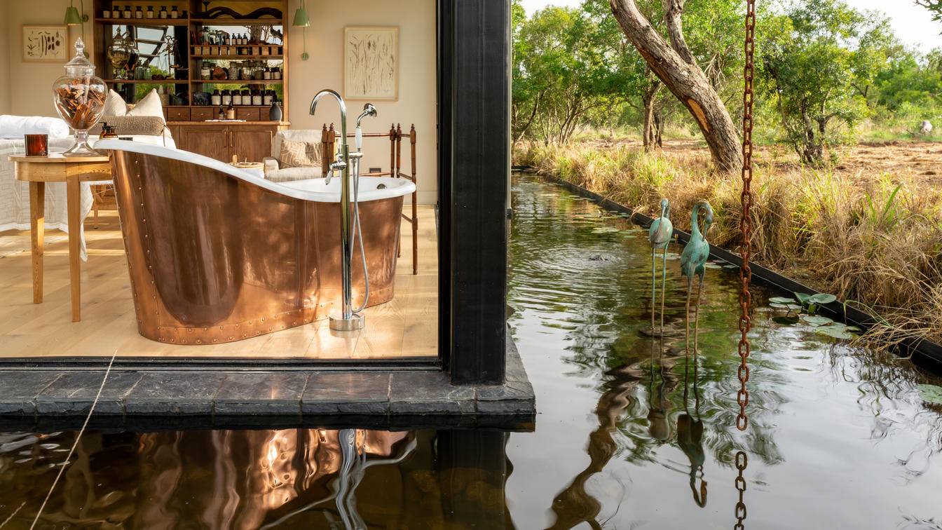 be that in the wrap-around reflection pool, cascading over metal, or in a beautiful copper slipper bath with its own view of the surrounding bush.