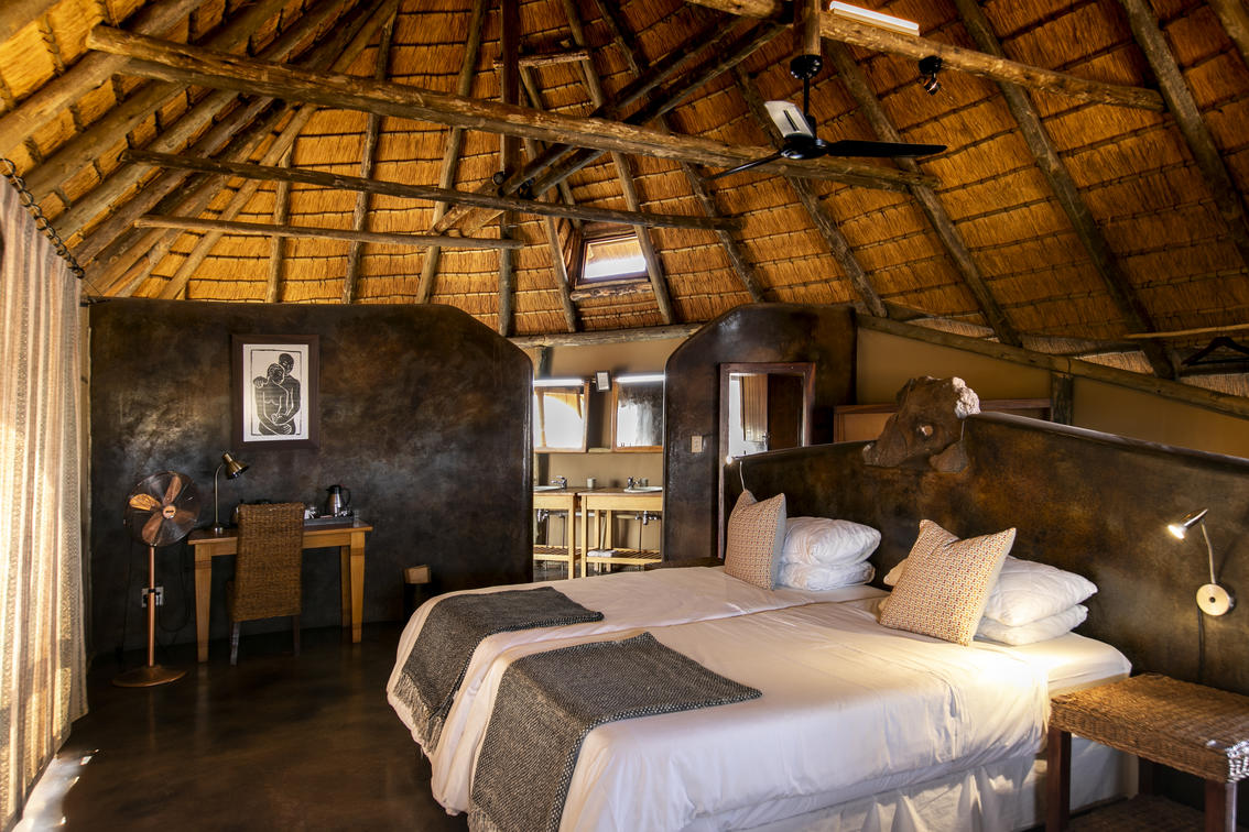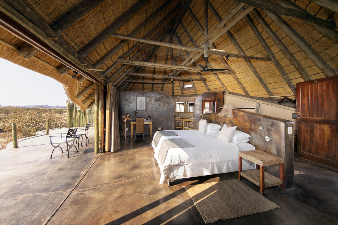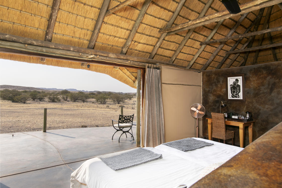 Wilderness Doro Nawas has spectacular views of the flat-topped mountains of the Etendeka Range, which begins north of the Huab River. The camp comprises 15 canvas and thatch double rooms with en-suite facilities. Each is built on a raised wooden deck, with gravel pathways linking the rooms to the main area. The beds are equipped with wheels to roll out onto the deck for sleep-outs under a canopy of infinite stars.
