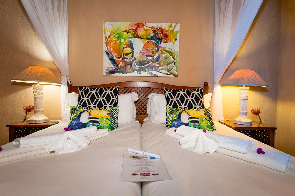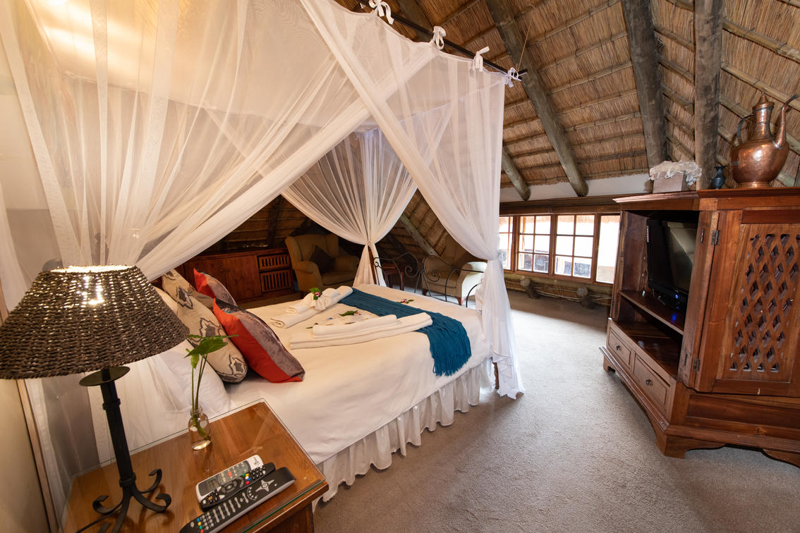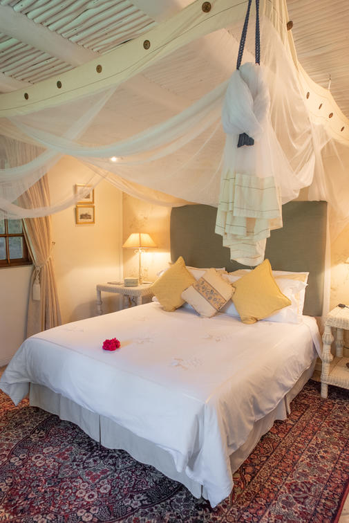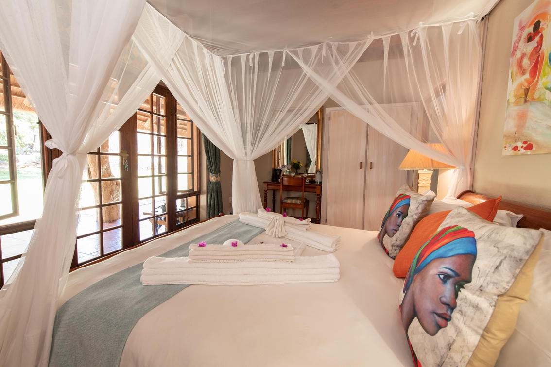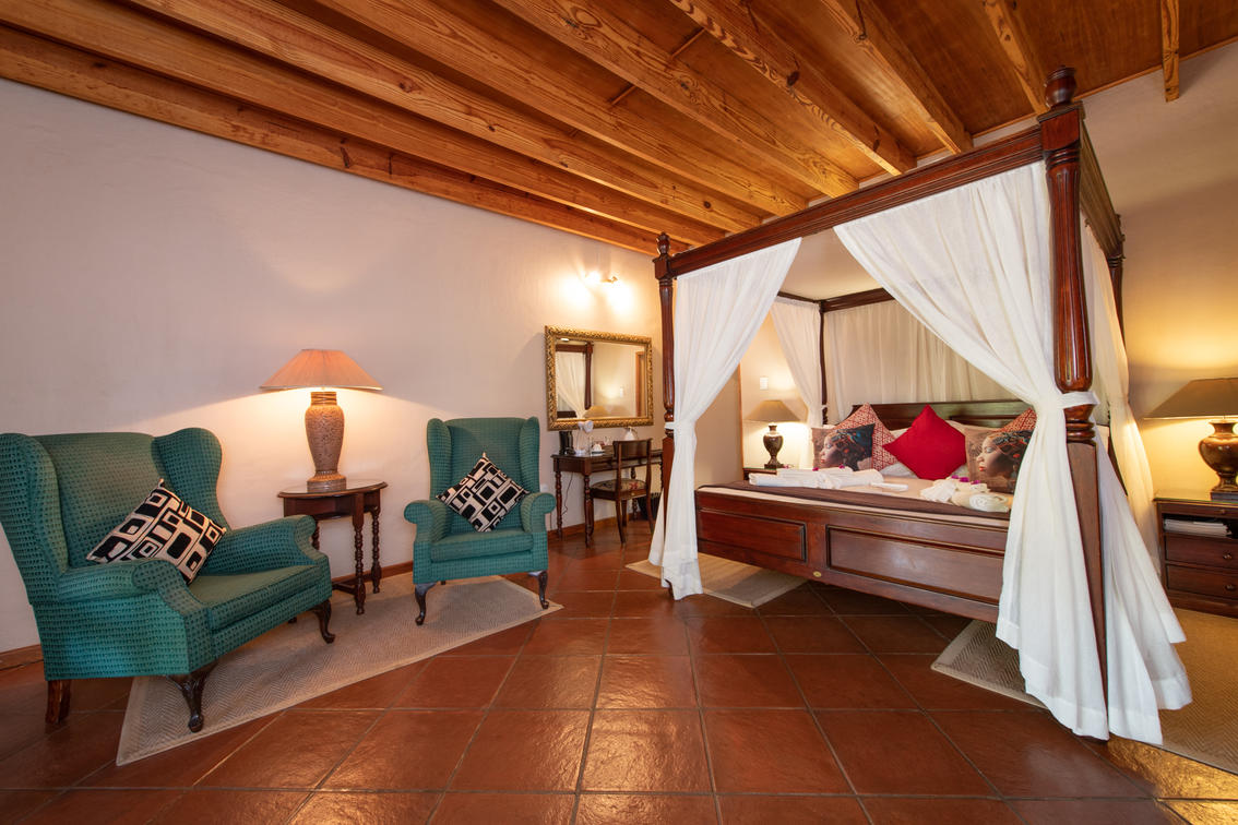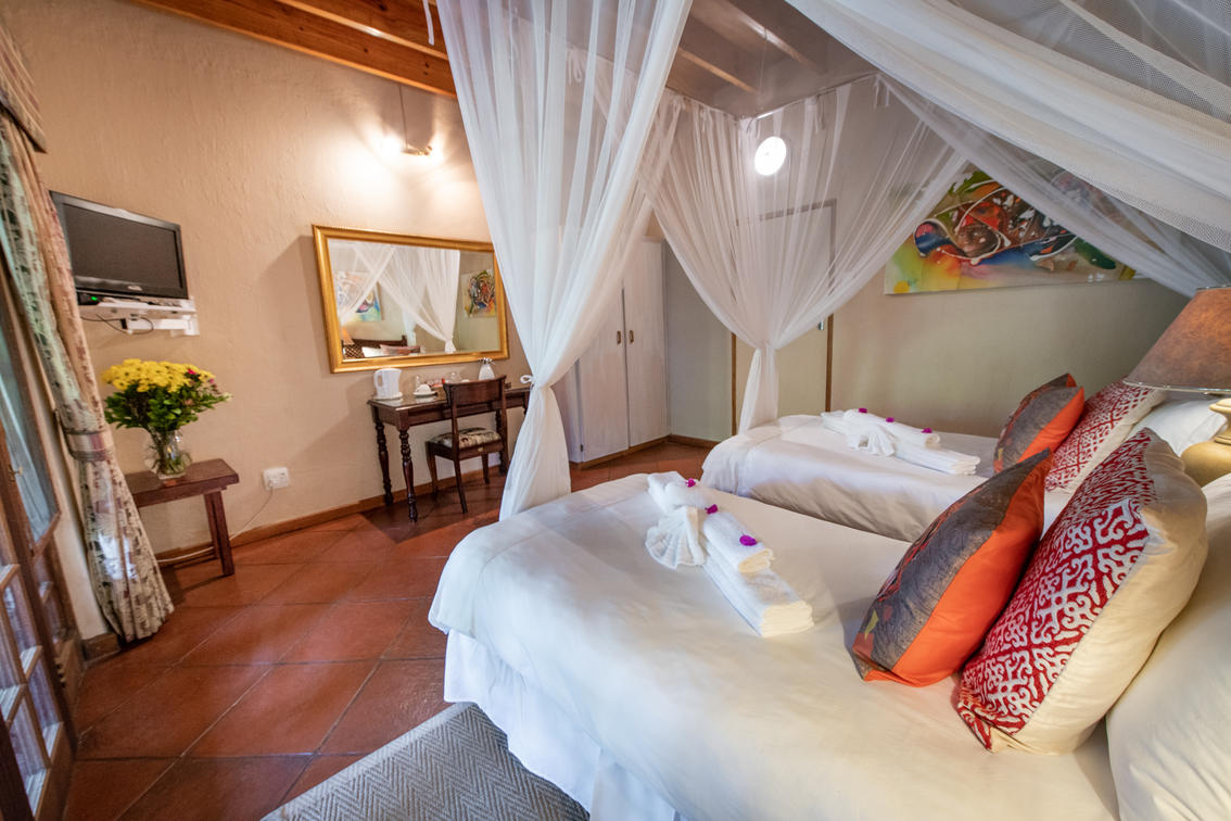 A blend of Victorian and African decor with a queen sized bed, fully air-conditioned and equipped with satellite TV, Internet as well as tea and coffee making facilities. Leads out onto the tranquil gardens where zebra and wildebeest wander by.
