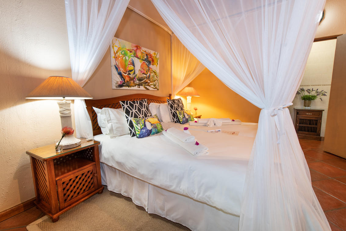 Tastefully furnished, queen sized bed, fully air-conditioned and is equipped with satellite TV, Internet as well as tea and coffee making facilities. Bathroom has bath only. Looks out onto the tranquil gardens where zebra and wildebeest wander by.