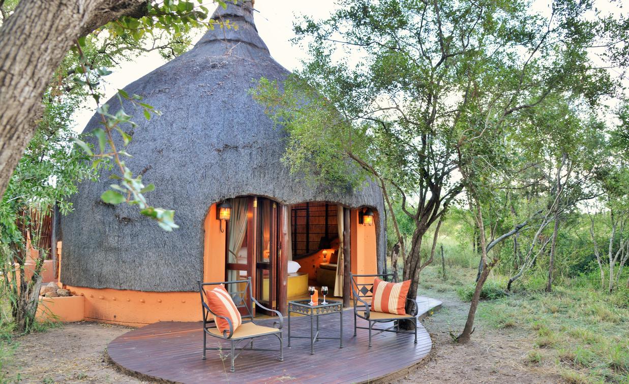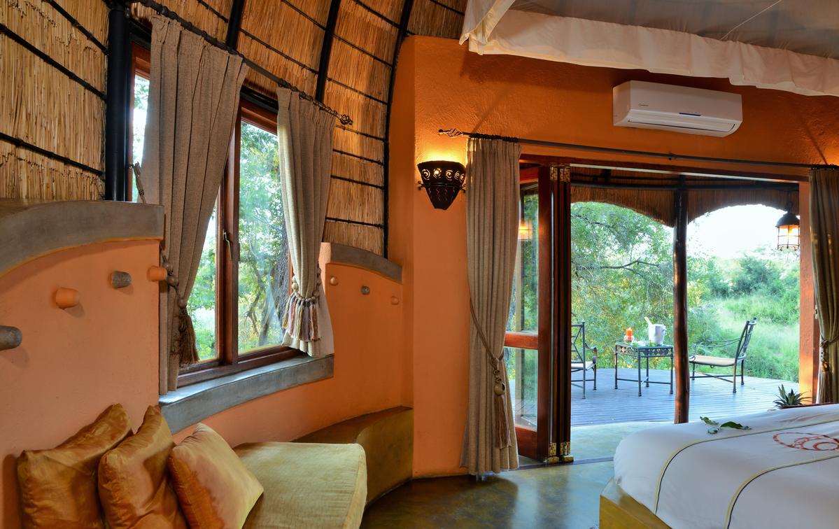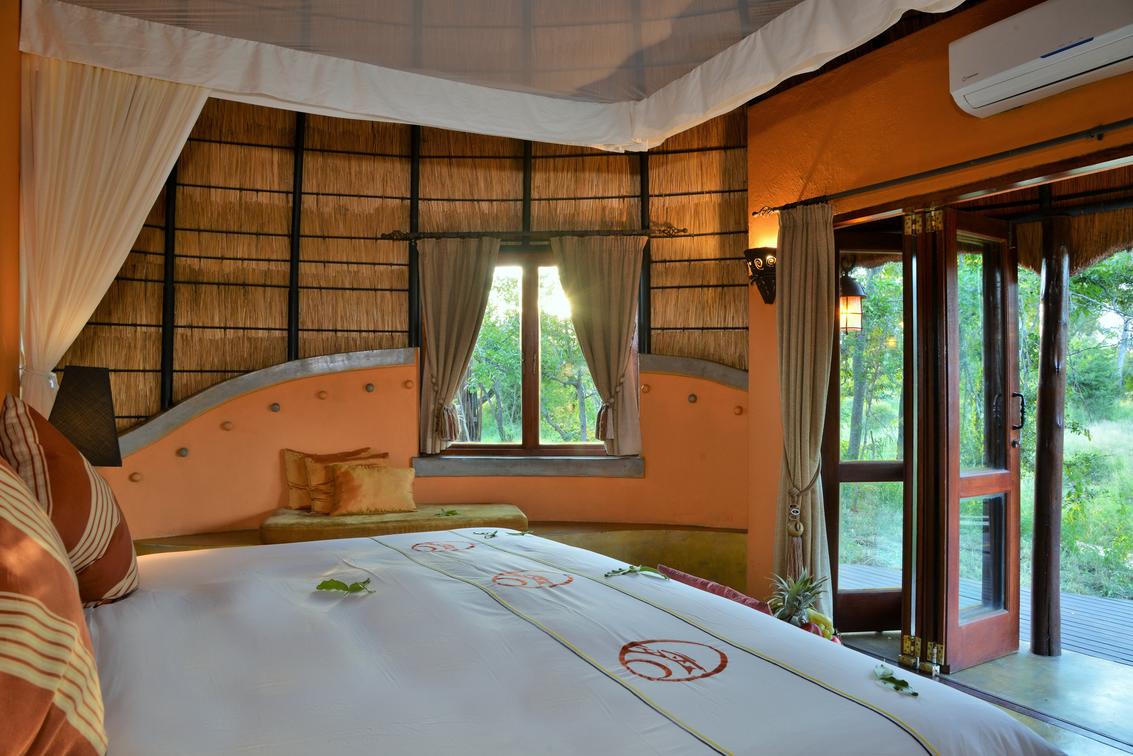 Guests are accommodated in six circular air-conditioned suites with traditional brightly earth-coloured walls, tapered thatched roofs and folding glass doors that allow one to fully experience the wilderness.