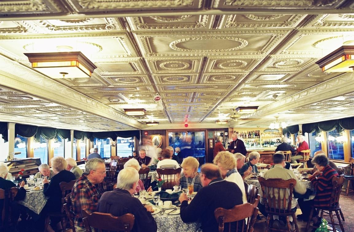 The Grand Saloon is decorated in early heritage style, from the ornate tin ceilings to the velour drapery and the warm wood tones. Wholesome, generous, home-cooked meals are served here, and the easy informality of unassigned seating is complemented by a menu that is announced in advance. In the evening, the Grand Saloon transforms into a private lounge where light, professional entertainment is offered.