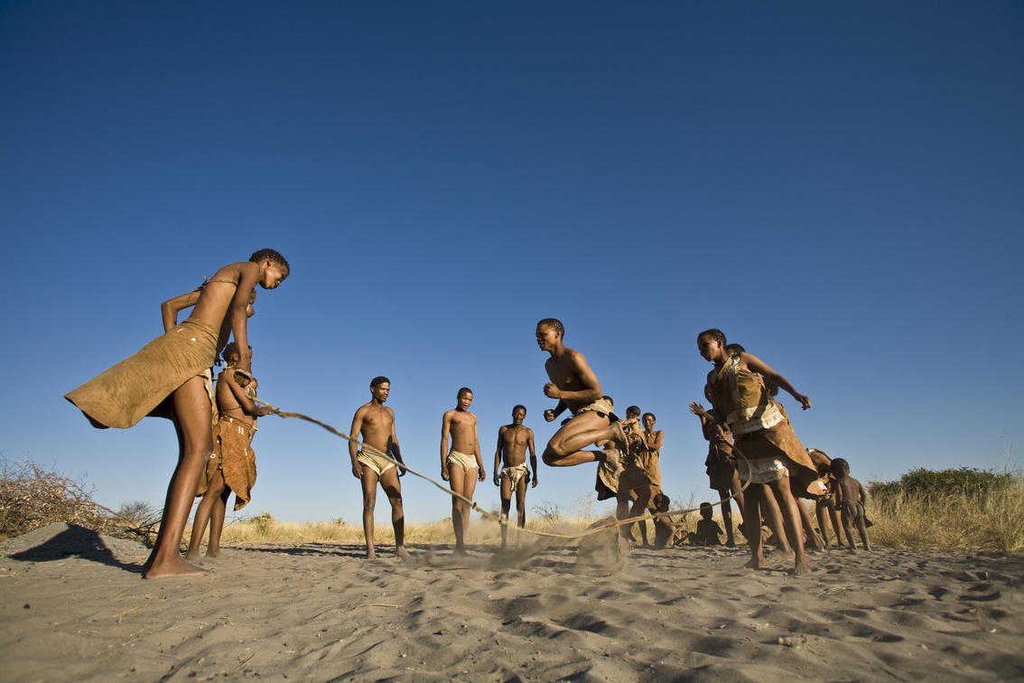 jumping rope with a piece of eland skin whilst they sing, clap, and show their amazing skipping talents.