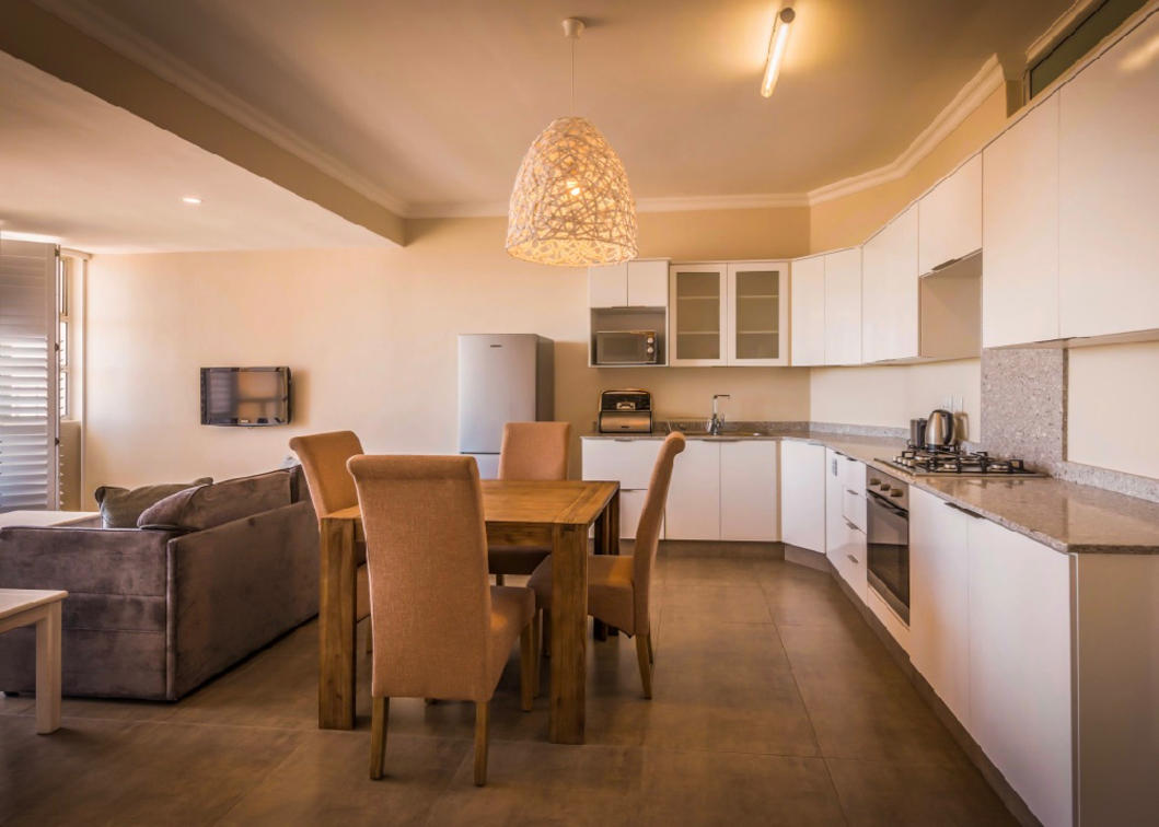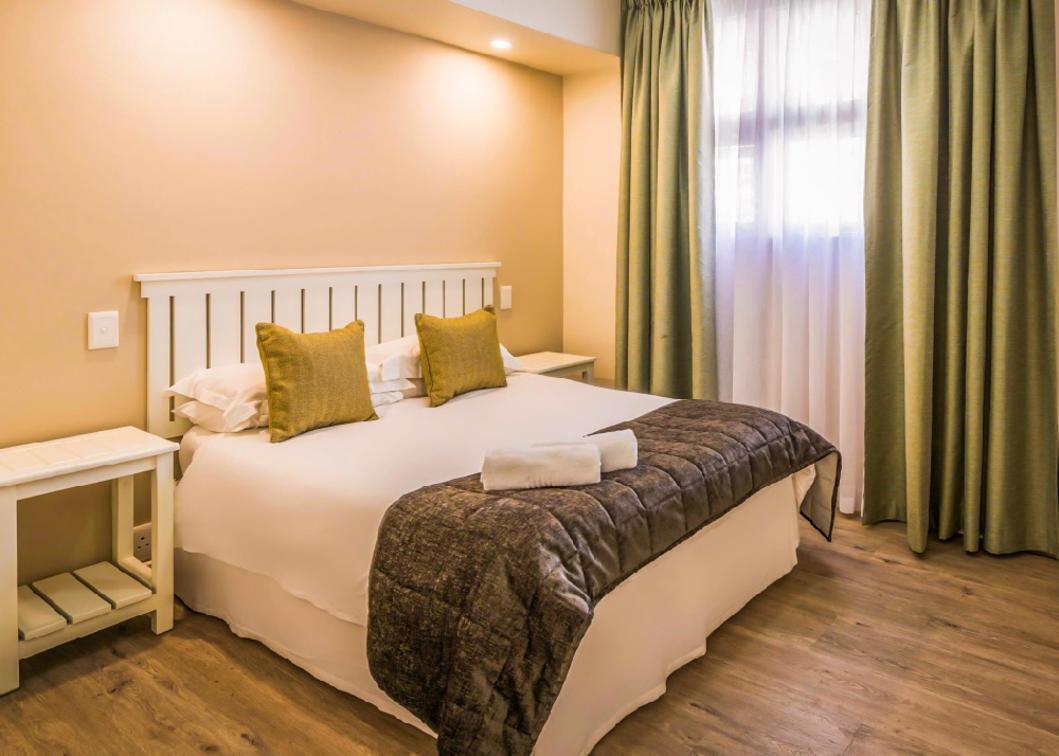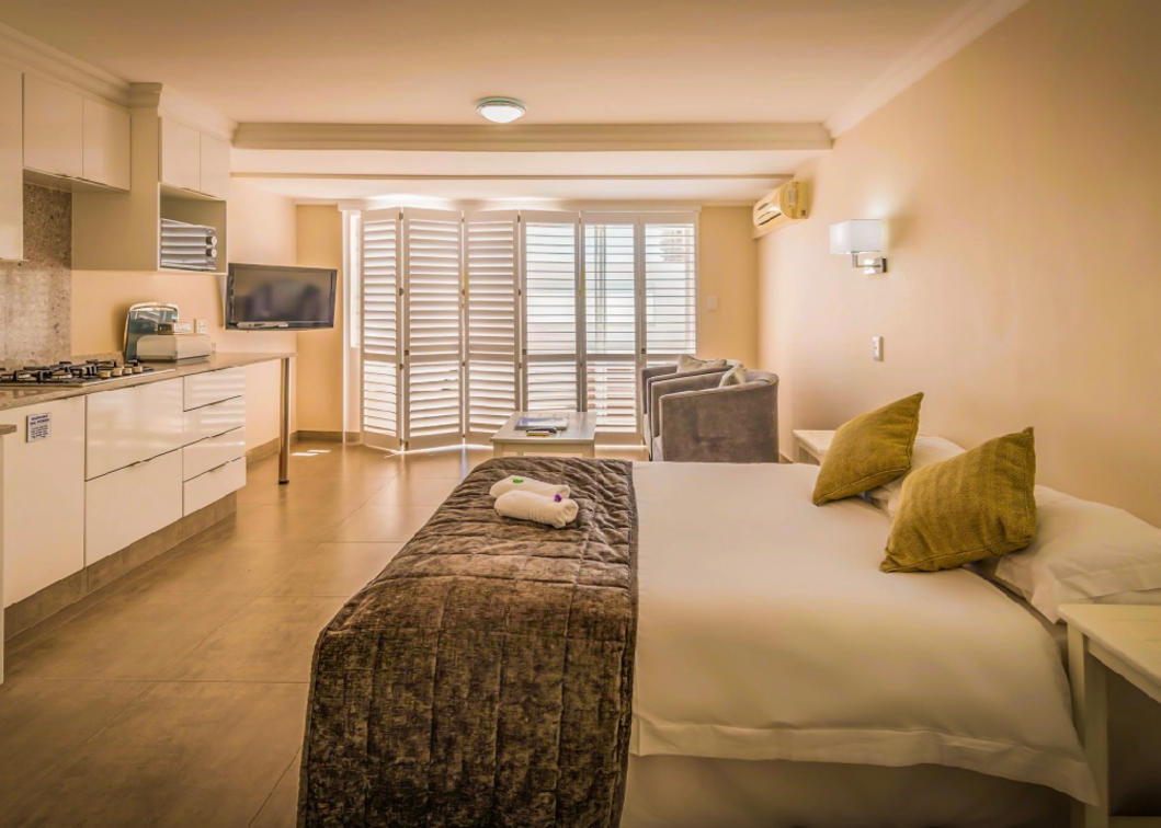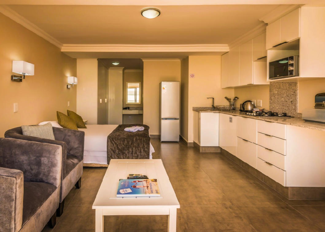 Fully self catering apartment sleeps maximum 4 people. Consists of 1 room and sleeper couch in the lounge. Bedroom has double bed. Lounge have 2 single sleeper couches (only suitable for 2 children under 12 years). Kitchen. Bathroom. TV with selected DSTV channels. Serviced daily except Sundays and Public Holidays.