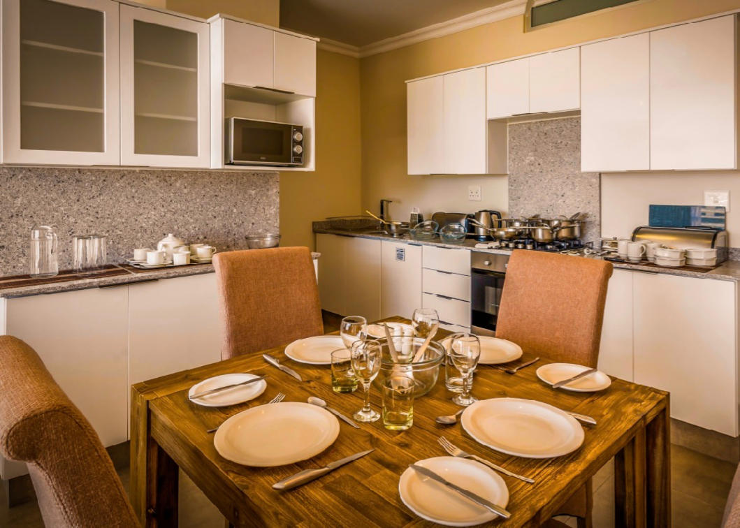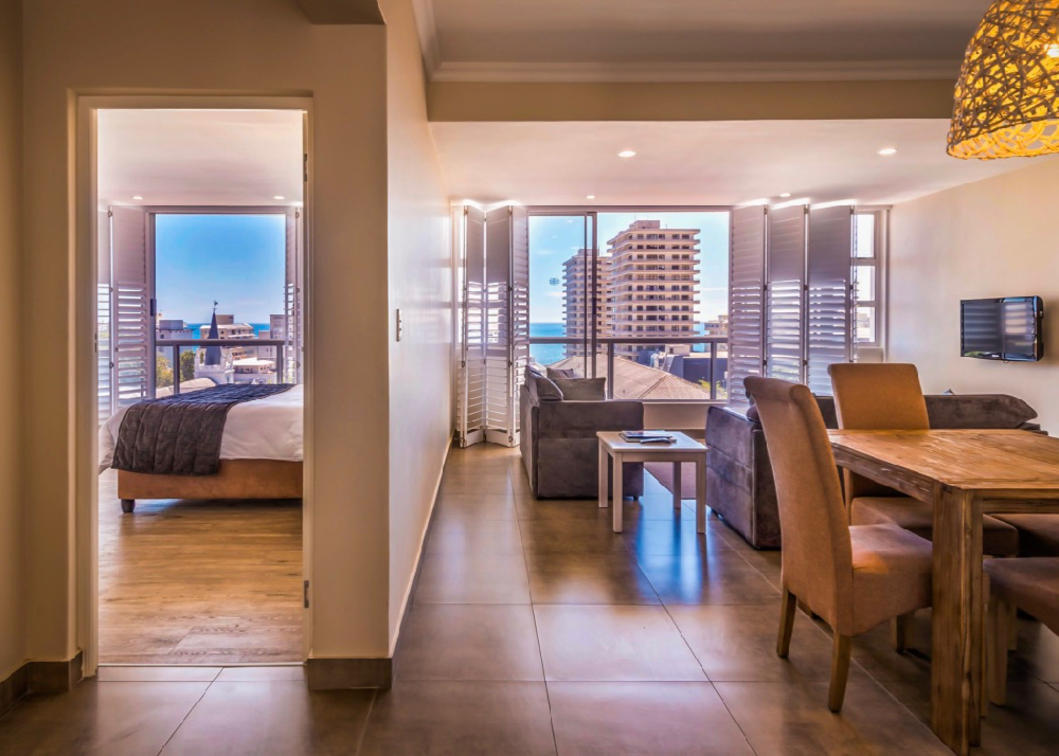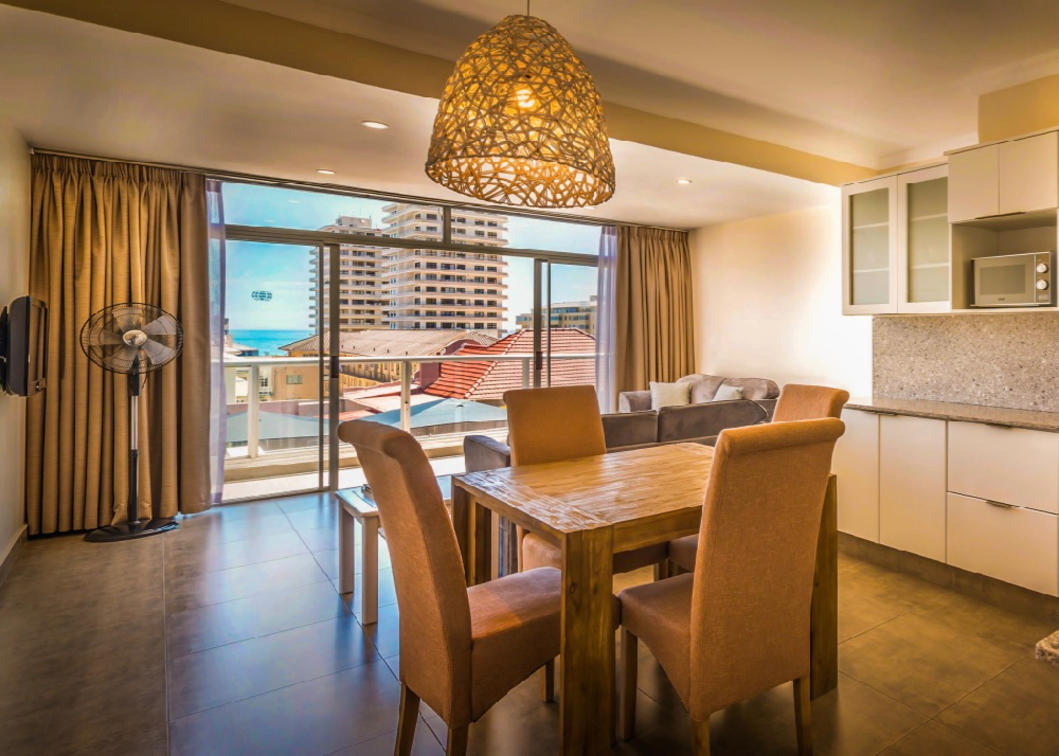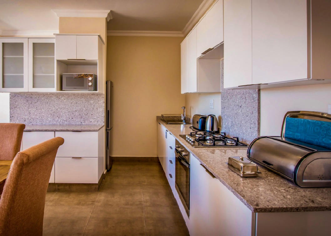 Fully self catering 2 bedroom 4 sleeper apartment. Consists of 2 bedrooms and 2 bathroom. Main Bedroom has a Queen bed with en-suite bathroom. Second Bedroom has 2 single beds. Bathroom. Kitchen and lounge. TV with selected DSTV channels. Serviced daily except Sundays and Public Holidays.