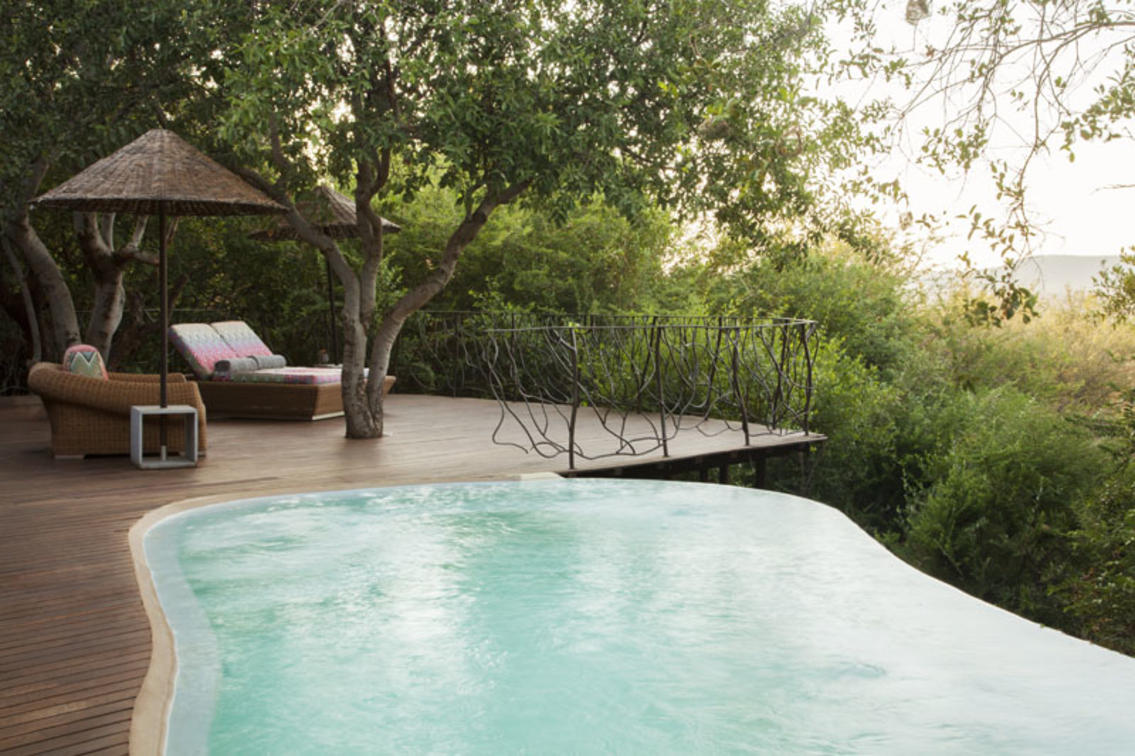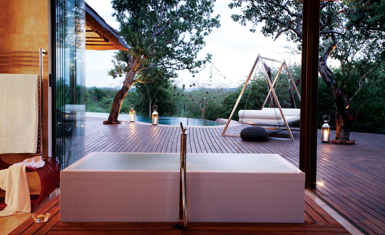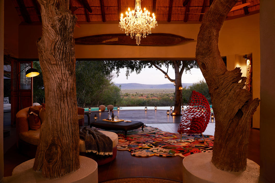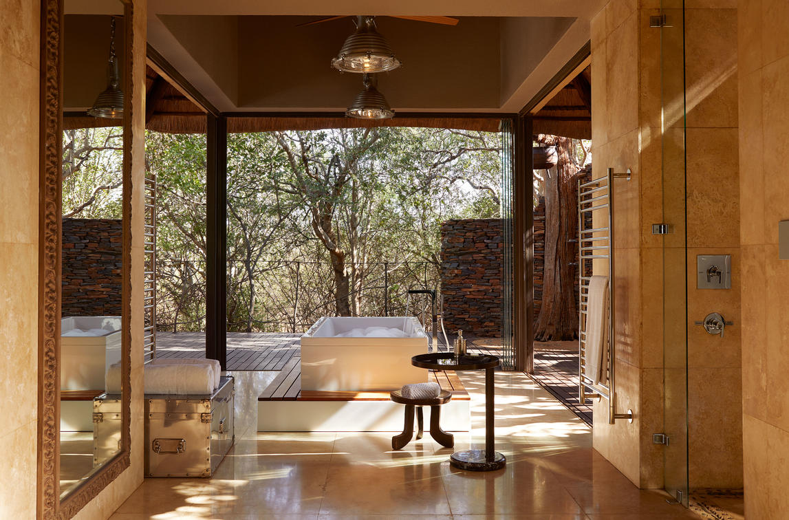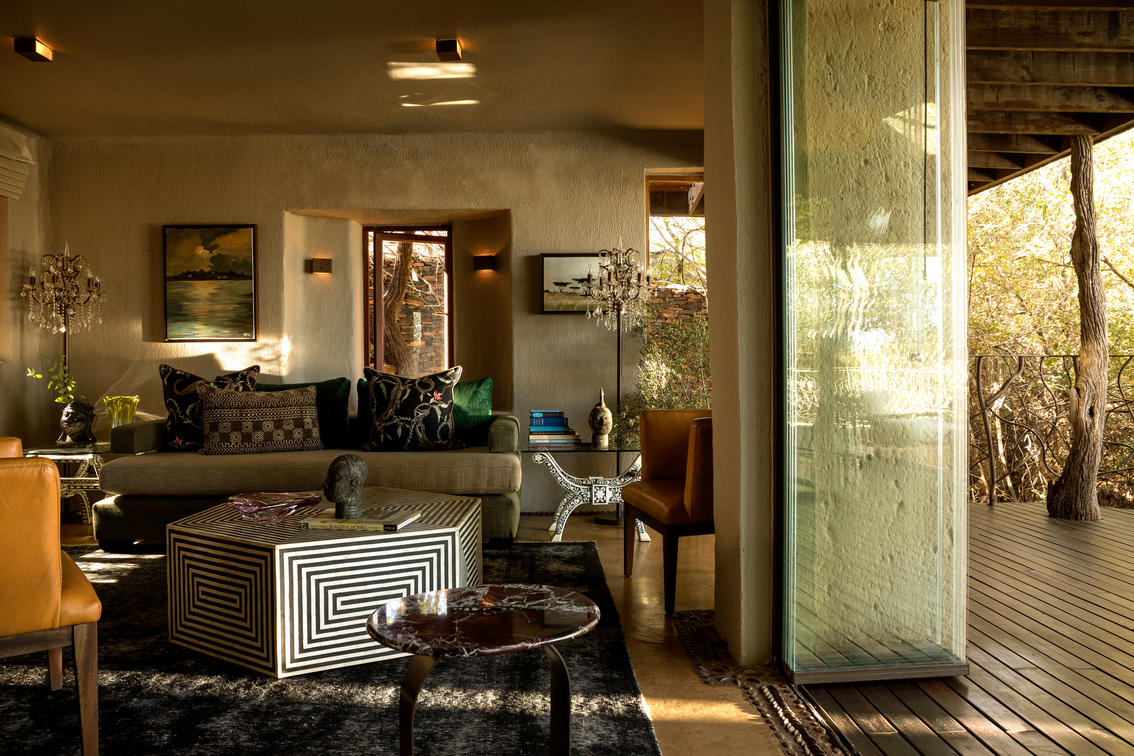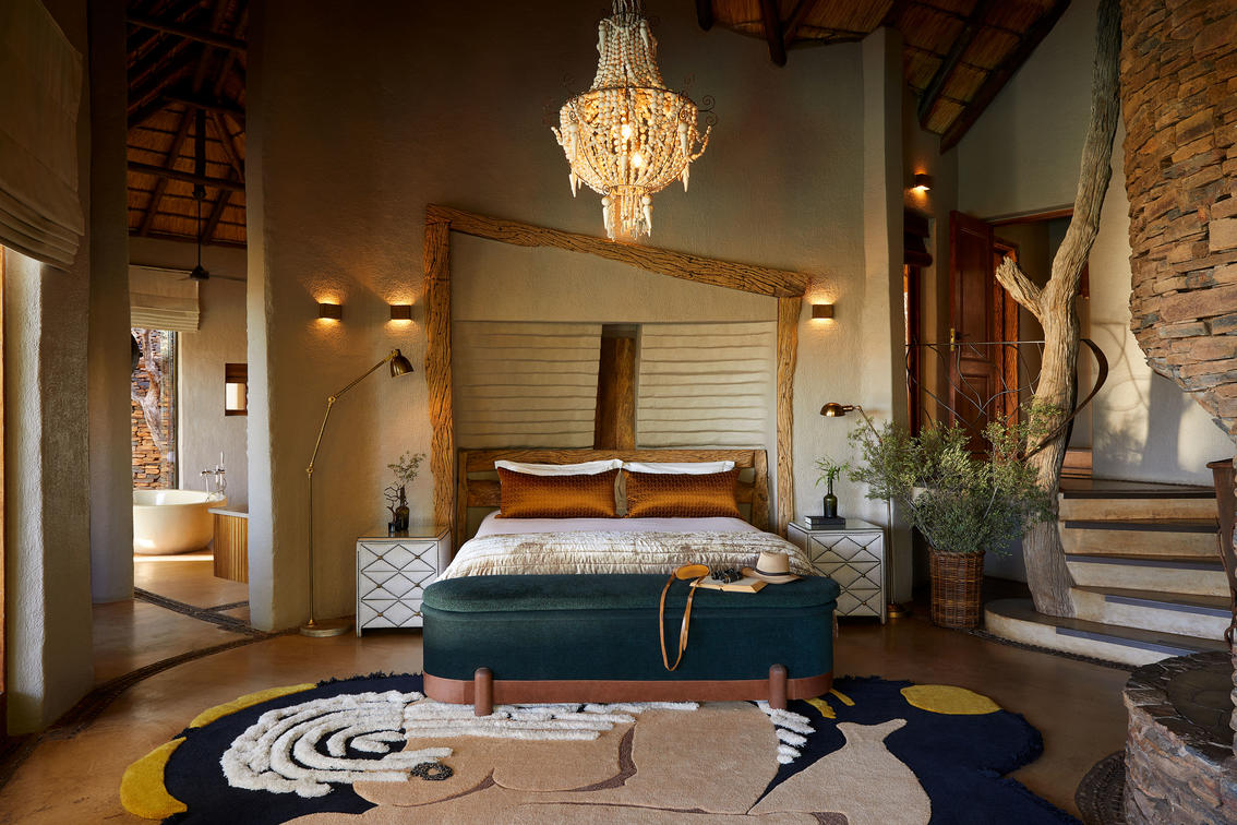 The Ngwedi Suite offers 232 square metres of comfort and elegance. The suite comprises a large bedroom and lounge area separated by a large stone-clad fireplace. The entire suites has floor to ceiling glass doors that open onto a large deck and private pool, overlooking the view. Ngwedi's bathroom features a copper bath, and shower with views onto the deck. This suite features an 'art rug' by South African contemporary artist, Cameron Platter.
