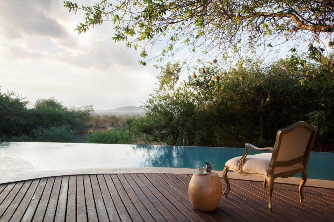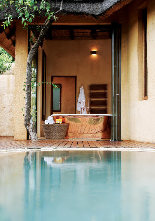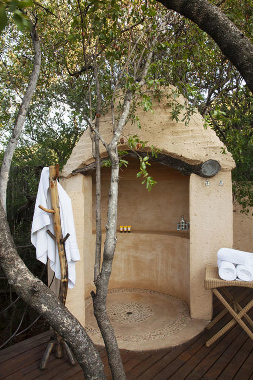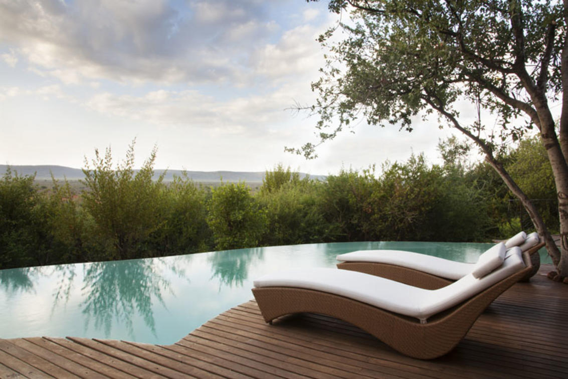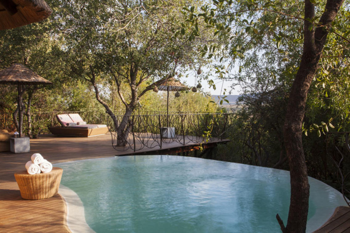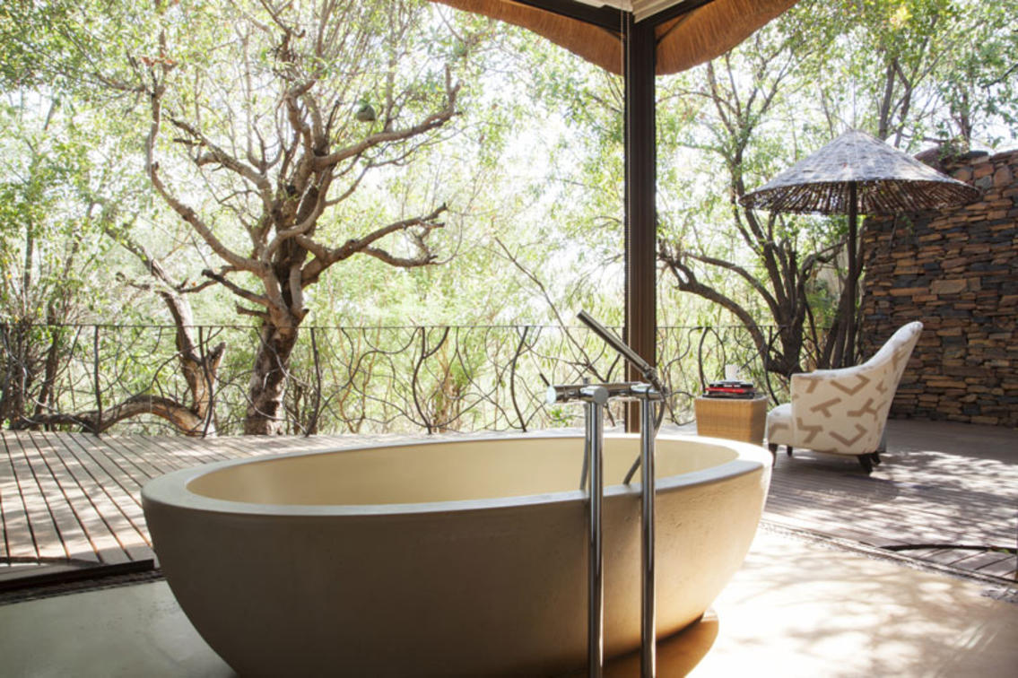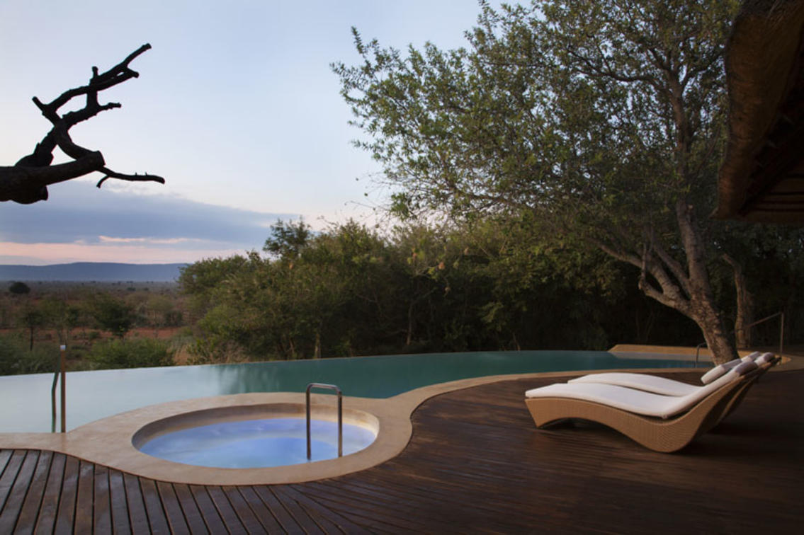 The Ngwedi Suite offers 232 square metres of comfort and elegance. The suite comprises a large bedroom and lounge area separated by a large stone-clad fireplace. The entire suites has floor to ceiling glass doors that open onto a large deck and private pool, overlooking the view. Ngwedi's bathroom features a copper bath, and shower with views onto the deck. This suite features an 'art rug' by South African contemporary artist, Cameron Platter.