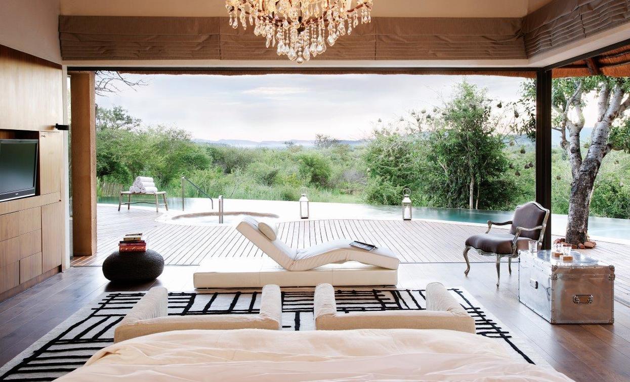 The 619 square metre Molelo Presidential Suite illustrates a perfect balance of colourful contemporary interiors combined with modern African and International design elements. The spacious two bedroom suite reveals a magnificent elevated view across the African landscape with floor to ceiling glass doors that fold away onto a spacious wooden deck, infinity pool, Jacuzzi and alfresco dining area.
