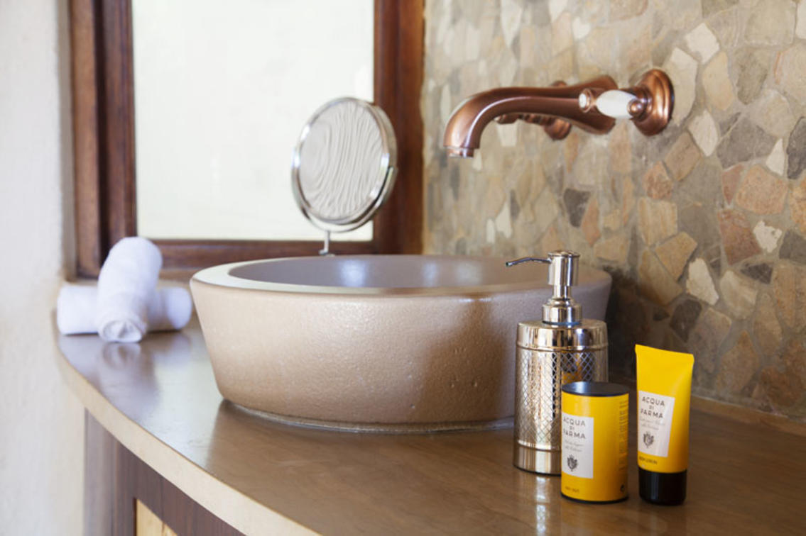 Measuring a generous 232 square metres, the Lesedi suite comprises a large bedroom and lounge area separated by a large stone-clad fireplace. The entire suite has floor to ceiling glass doors that open onto a large deck and private pool, overlooking the view. Lesedi's bathroom features a ball & claw bath, a shower with views onto the deck. This suite features an 'art rug' by South African contemporary artist, Nabeeha Mohamed.