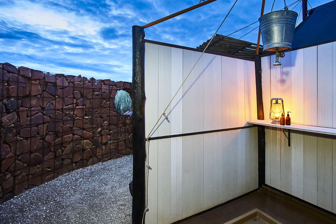 En-suite Meru tents fitted with 1 x double size bed, with an open-air bucket shower.