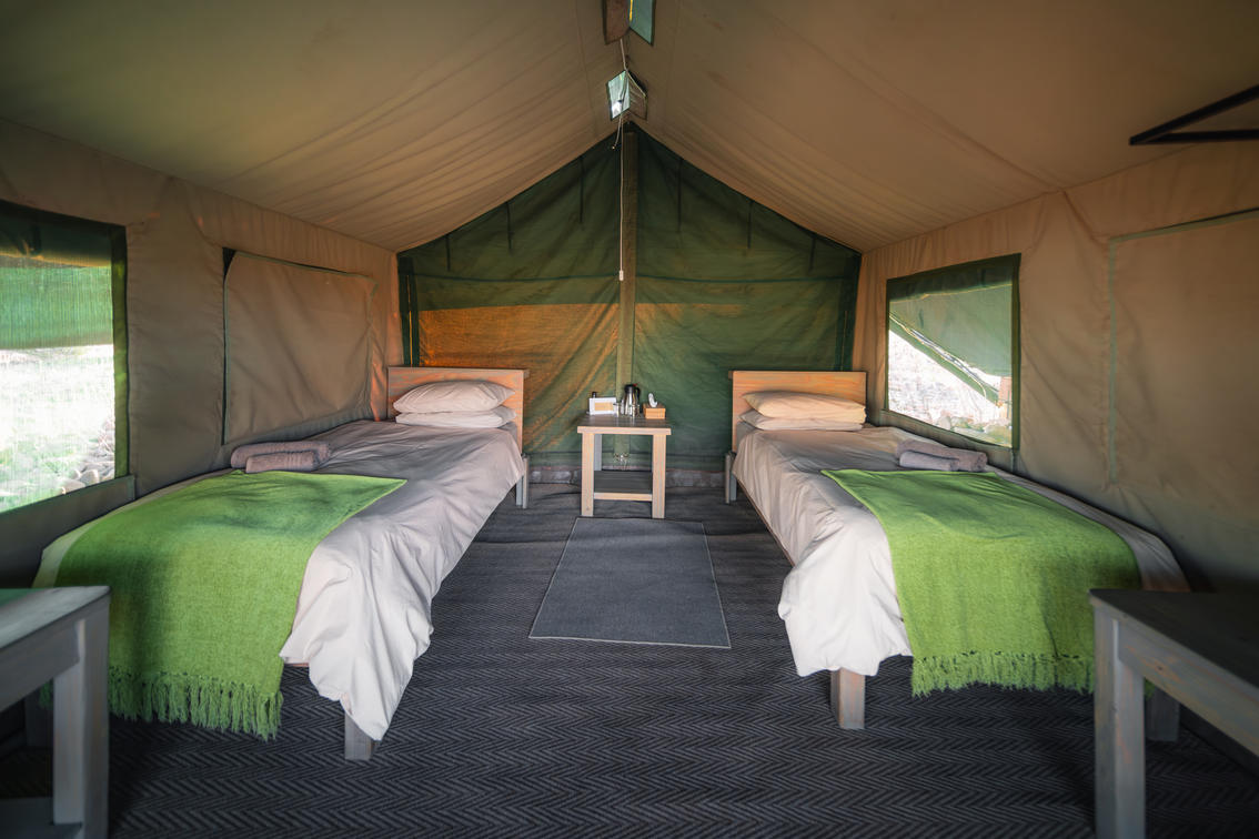 En-suite Meru tents fitted with 2 x 3/4 size beds, with open-air bucket shower.