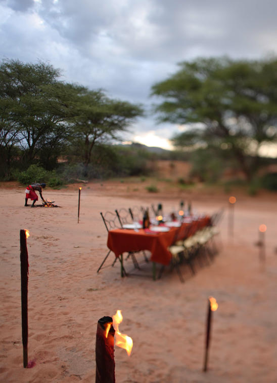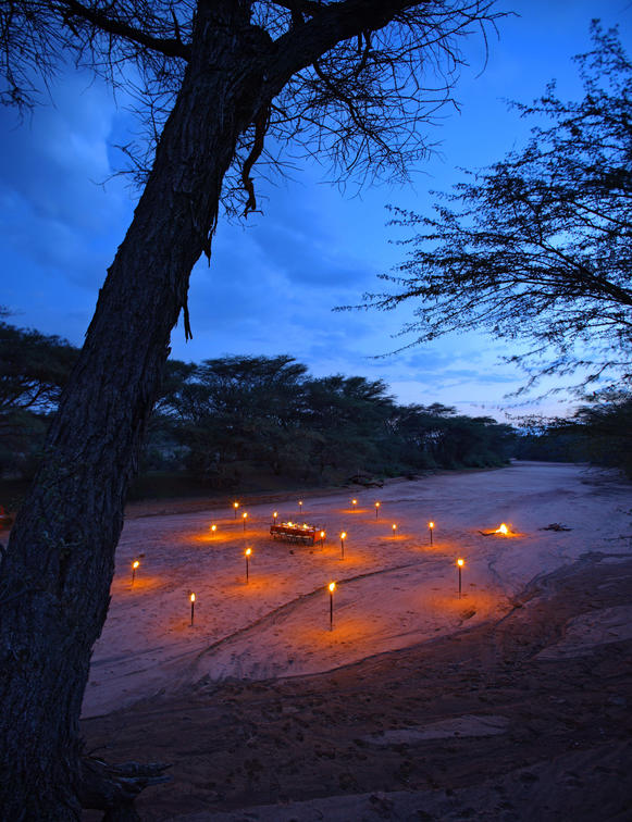 Guests enjoy breakfast along the Ewaso Nyiro River and starlit dinners in a dry river bed under the vast African skies (weather permitting). Saruni loves to take guests to their secret spots for a bush dinner or for a picnic lunch that allows guests to be with elephants, waterbuck, lion, impala and the Samburu Five that stop to take water. Note – bush dinners are usually part of a group, unless the lodge can accommodate otherwise.