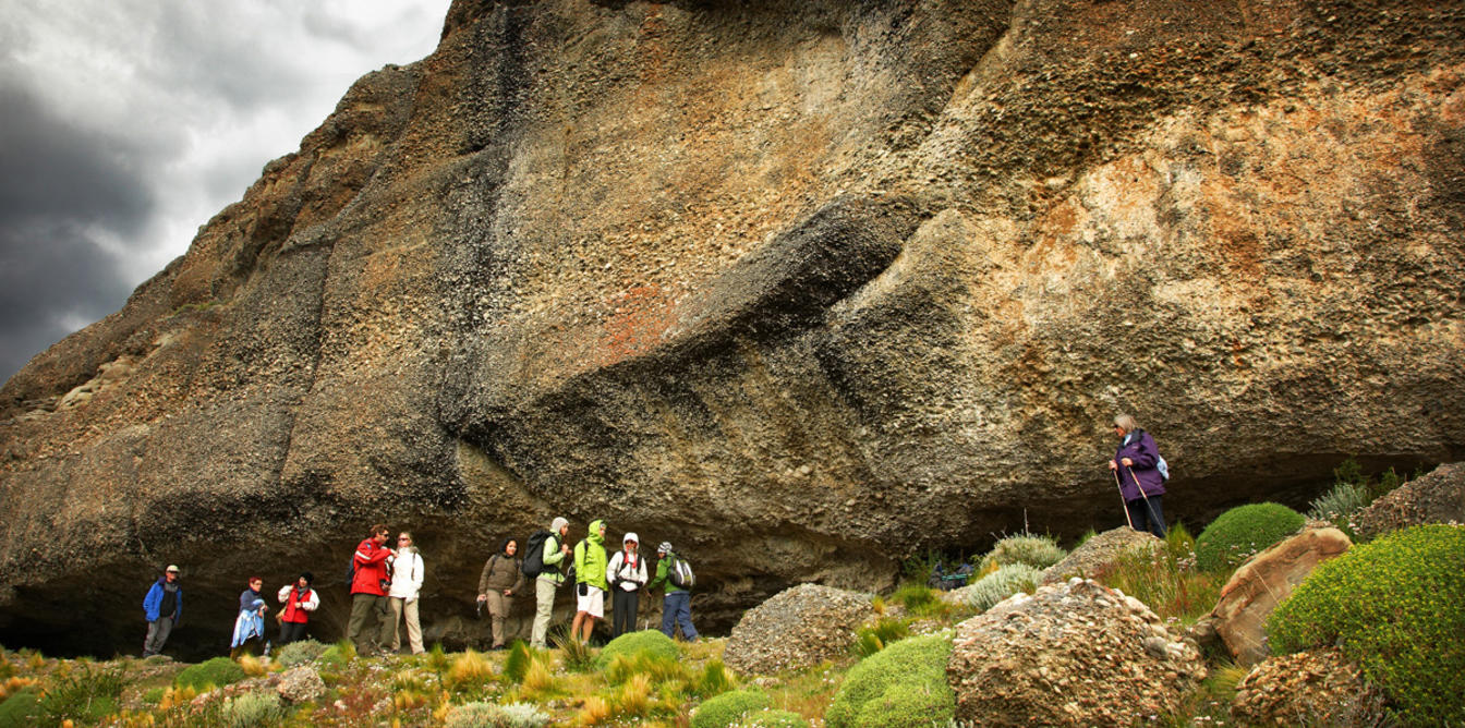 The day starts leaving the hotel at 7:45 a.m., where you will take a van that will take you to the Sarmiento gate of the National Park. Afterwards you will walk 9.5km on a mostly flat terrain, crossing the pampas, where you will understand ancient geological processes that have shaped this world biosphere reserve, finding records of the first inhabitants of these lands. It is a protected territory that you can only enter with certified guides where you can find Aonikenk rock paintings as well as a great wildlife activity, mainly guanacos, as well as a high presence of birds of prey, scavengers and pumas.