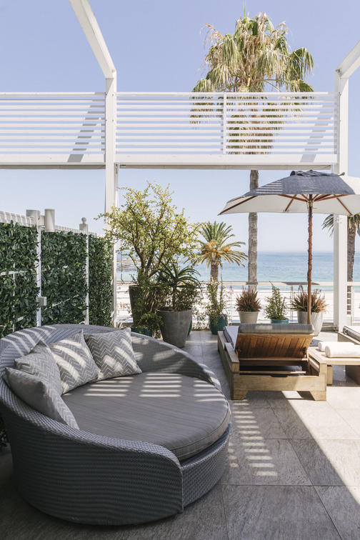 The balcony has a shower, dining table, sun loungers and uninterrupted sea views.