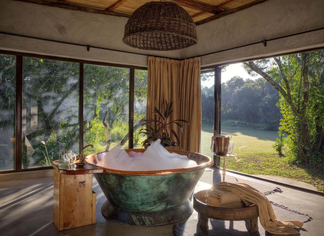 A private cottage with a huge bathroom with a copper bath, outdoor shower, a large verandah and lounge area. This cottage is perfect for those couples who enjoy waking up with the sunrise across the river, privacy, and watching hippos wallow below.