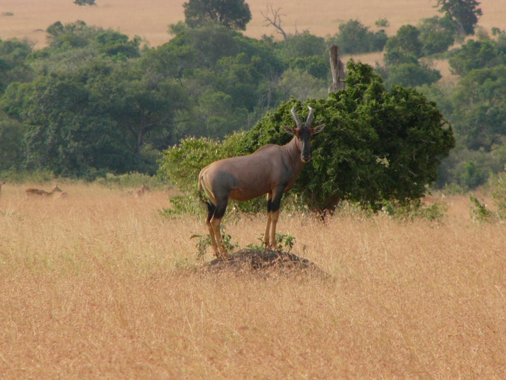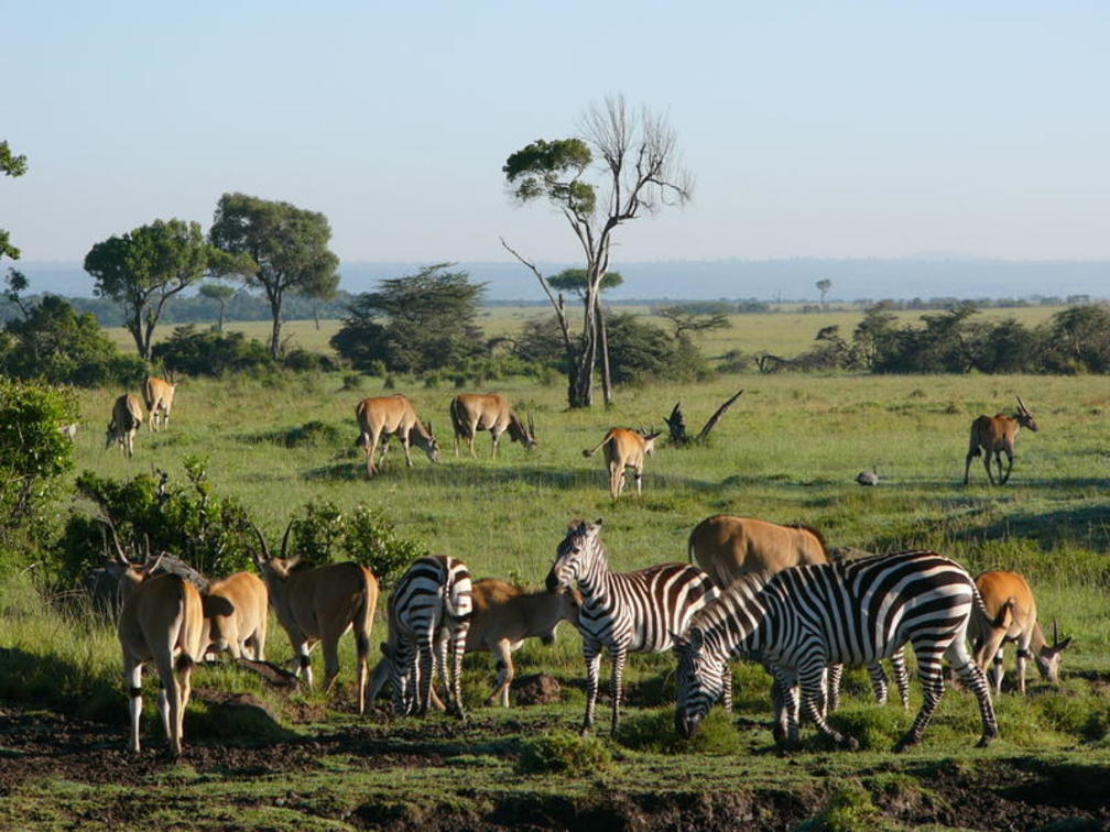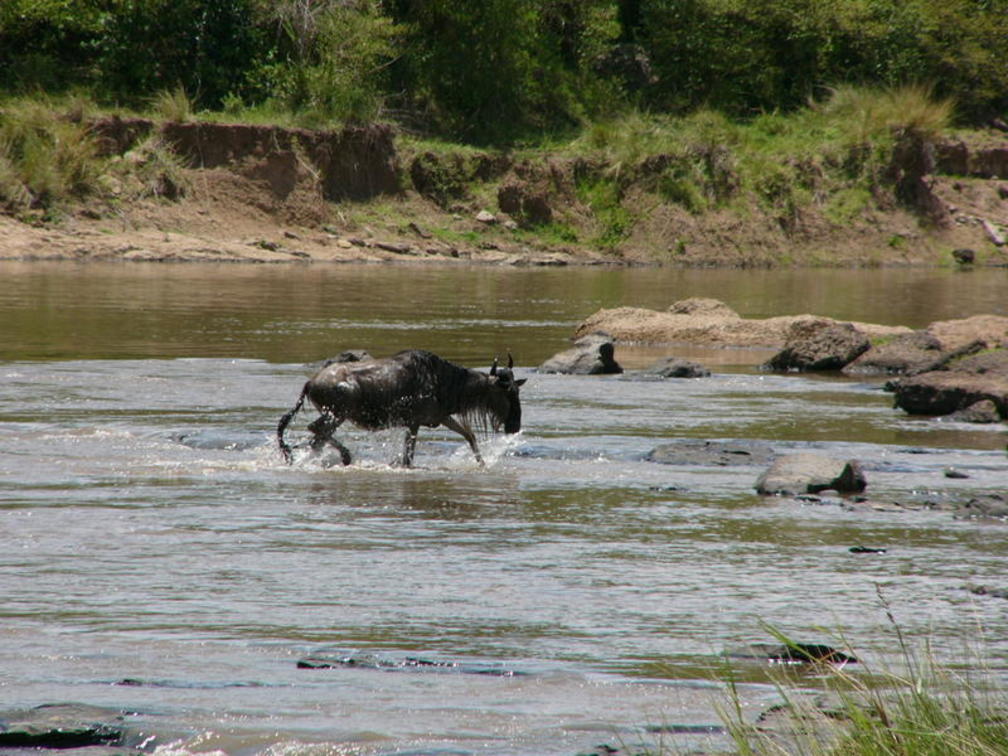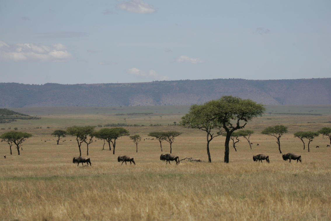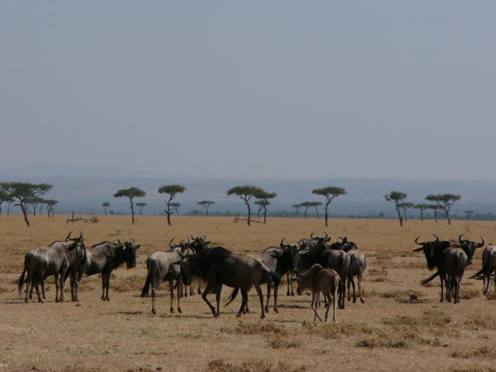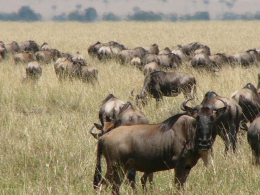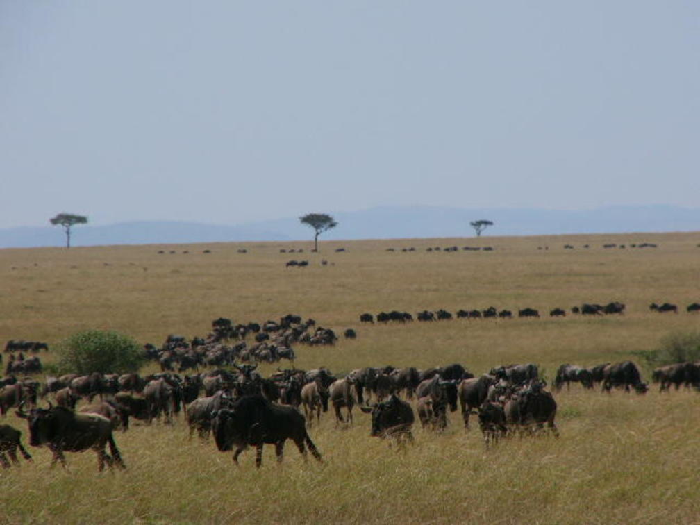 "The Masai Mara and adjoining Loita Plains form the northermost part of the 25,000km Serengeti-Mara ecosystem. The Mara receives the highest rainfall (1000mm average, 1200mm a year at Musiara) of the entire ecosystem. Rain falls here throuht the year, with peaks usually in December, January and April. Plenty of grass remains after the Serengeti plains to the South have dried up. This beneficient ecosystem supports a wildebeest population of at least 600,000. Together with the associated herds of 200,000 zebra and 350,000 Thomson gazelle, they form a vast assemblage of ungulates whose annual movements trough the ecosystem is known as "The Migration". The sight of hundreds of thousands of these animals moving together through the seas of grass must rank as the greatest wildlife spectacle on earth.
