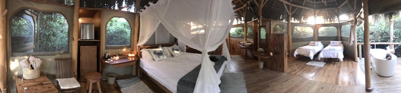 King size bed with an extra room with two single beds comfortable for 4 adults or parents with two children, King bed can be converted to twin beds and an additional single bed can be included for a third child. Ensuite bathroom with indoor and outdoor hot and cold showers, a bath on its private deck. A canvas and thatch unit situated in the forest canopy with its own beachfront and thatched beach umbrellas.