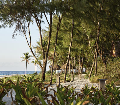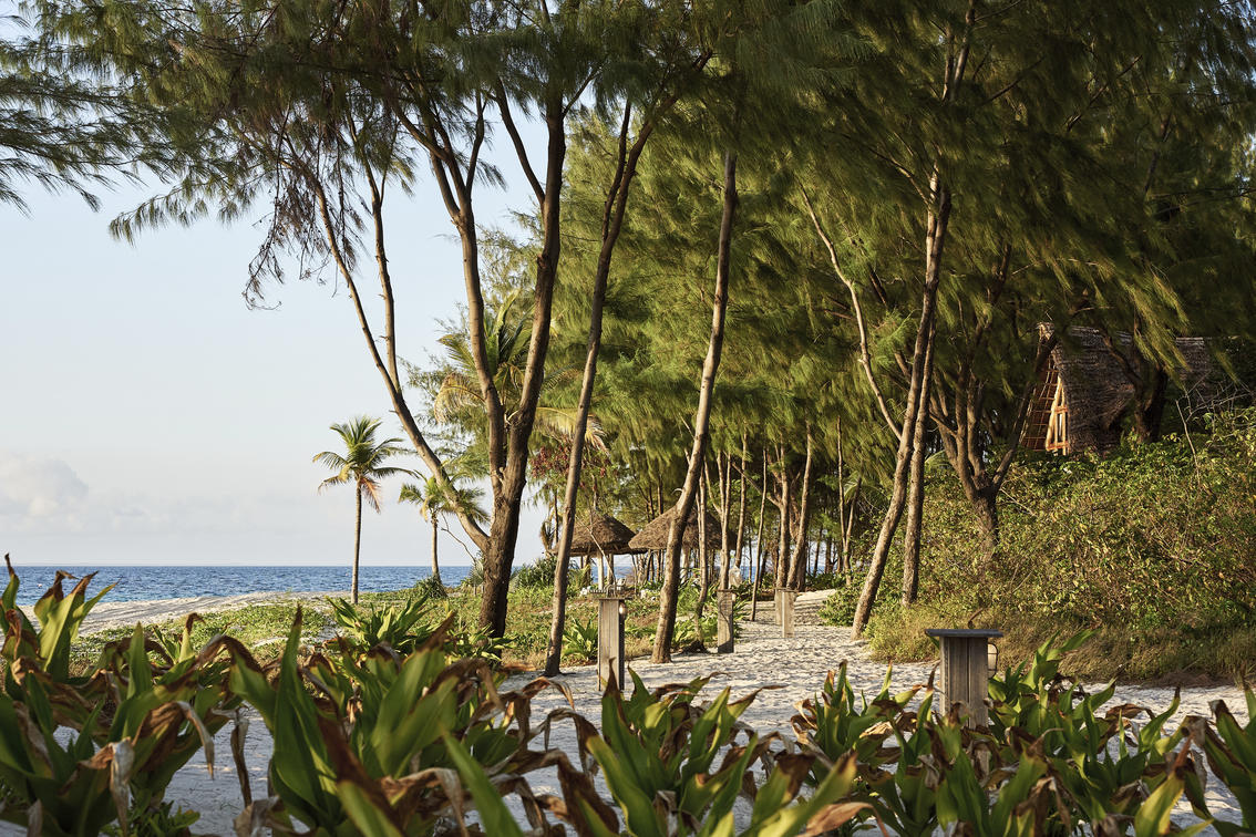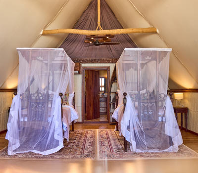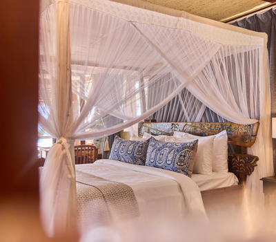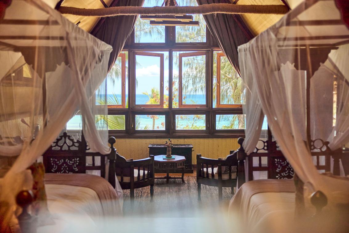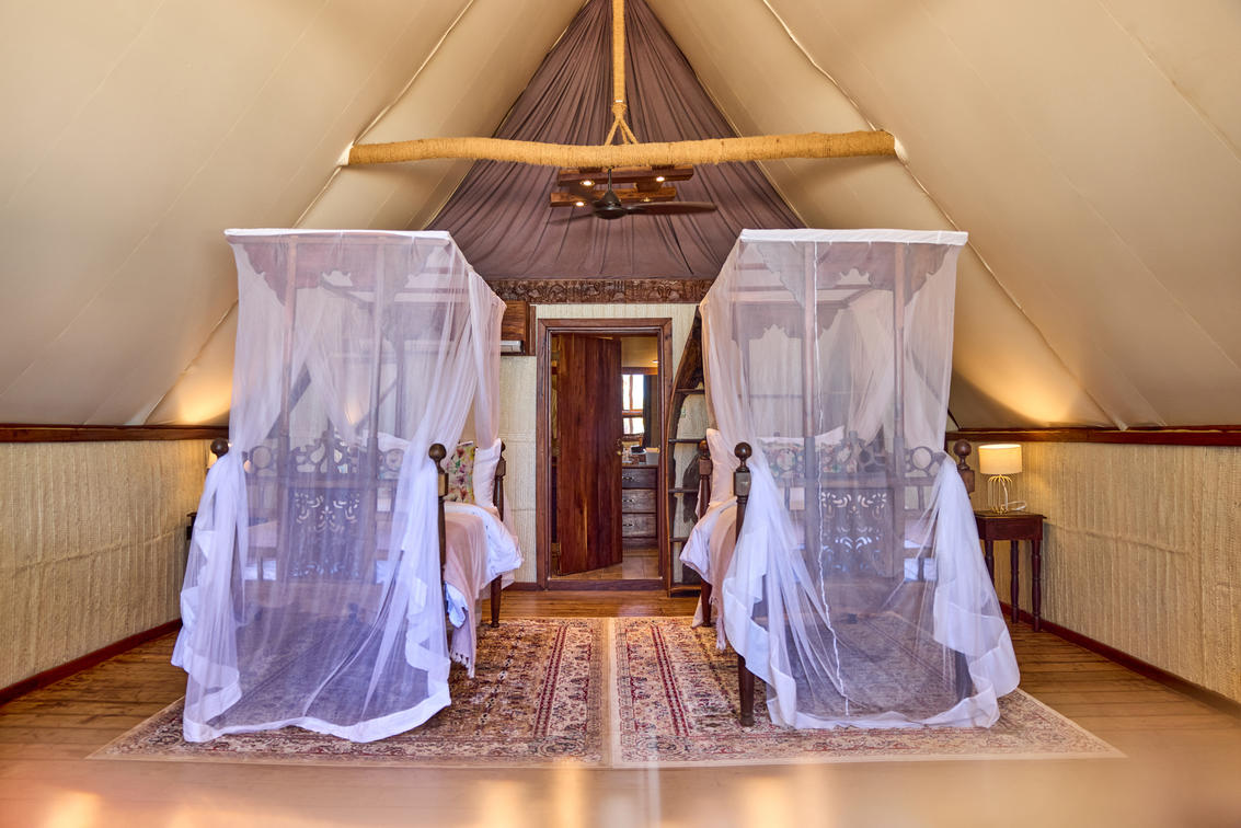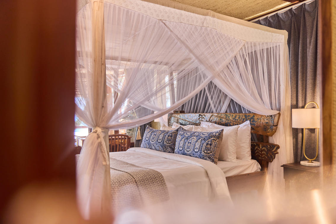 Crafted with hand-carved furnishings and artisanal textiles sourced from nearby Mafia Island, one banda is appointed with two king-sized beds, while the other offers a king bed alongside