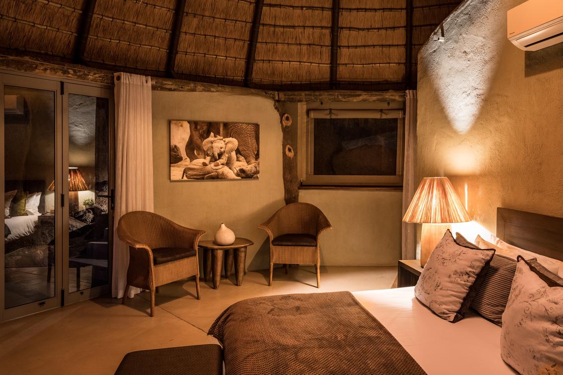 Situated behind large boulders, this west facing room consists of a thatch roof, glass stacking doors, an air conditioned room with king-size bed, ensuite facilities and its own private deck with heated splash pool overlooking the valley below.