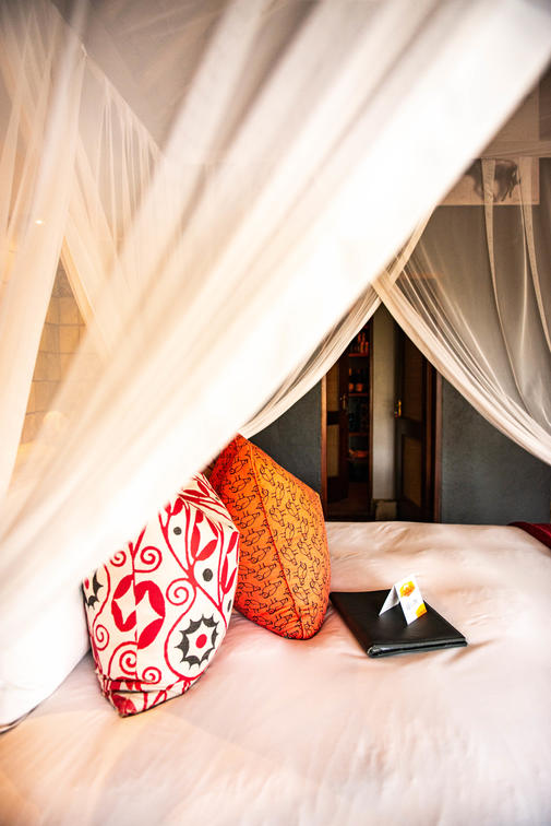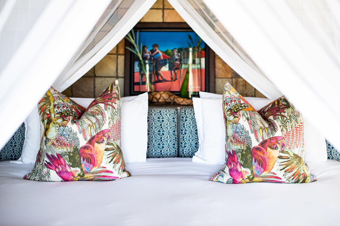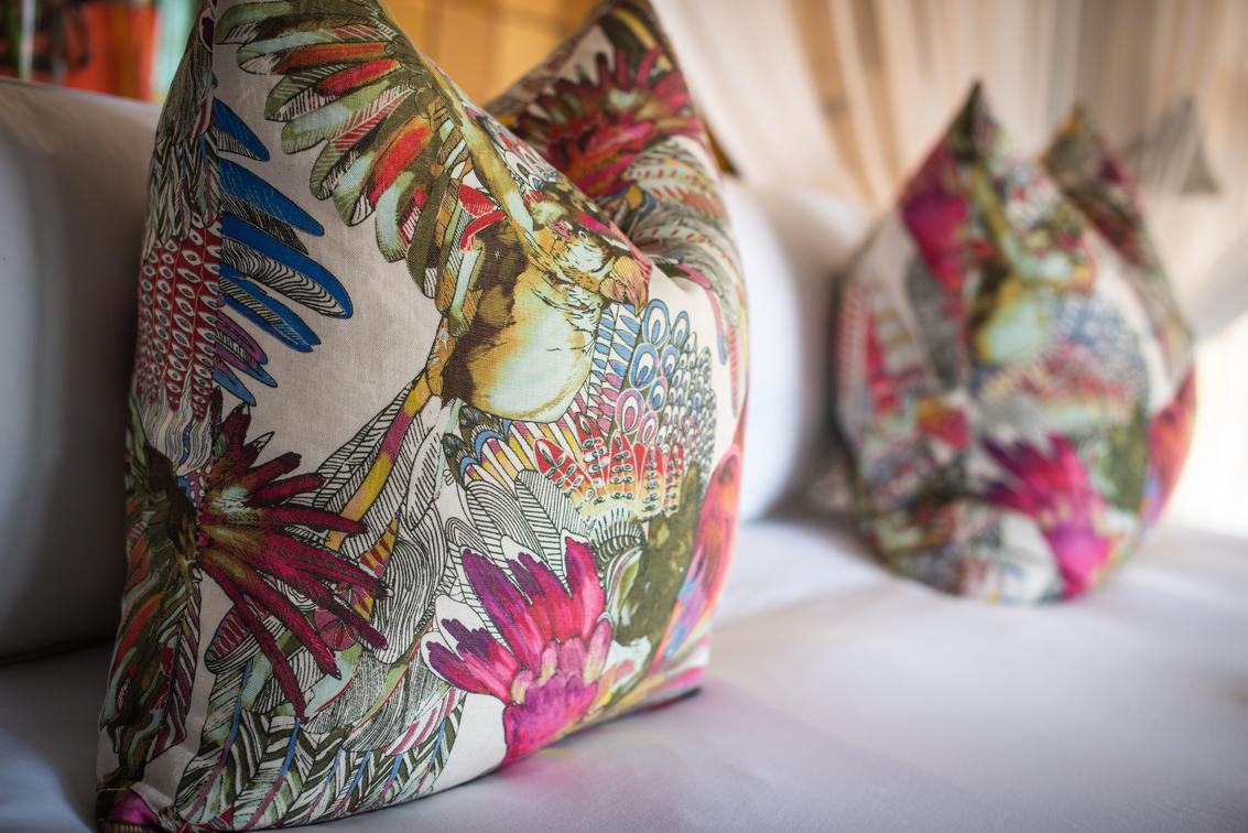 Featuring locally produced and designed fabrics, furnishings and crafts, the main house is a show piece of custom creations including a brightly coloured calabash chandelier, woven basket wall art and a unique sofa that makes a bold decor statement. The sections of vibrant colours are anchored by dark wood antique furniture, exposed thatch ceilings and concrete floors.