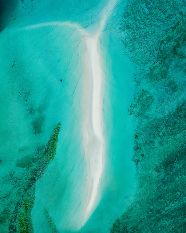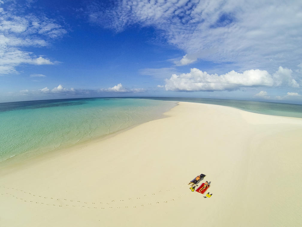 At low tide, a sandbank protrudes to offer a walk on the purest white coral sand. The perfect beach to relax on, surrounded by azure blue waters.