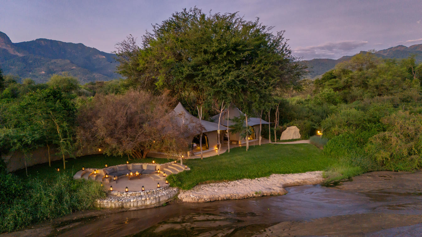 Two adjacent tastefully appointed and private en-suite canvas tents set under the canopy of massive old Loimugie (Newtonia) Tree, overlooking a dry river bed with views of the adjacent mountains. A communal platform joins the two tents allowing families with young children to feel close, secluded and private. Emporer size beds with the highest quality cotton linen, cool floors and beautiful decor all lend itself to a luxurious tented experience. A small outdoor seating also allows you take in the views and expanse of the river bed. A small outdoor seating is a beautiful addition to this unit and offers one of the best views in the camp.