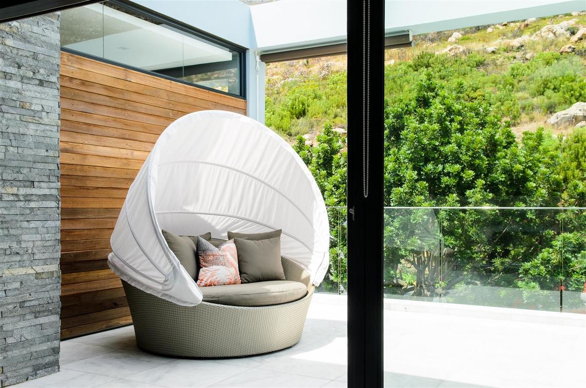 Varietals of the unique and fragile plants decorate the walls of this luxury bedroom and its en-suite bathroom. Their deep purple hues compliment the crisp white linen of the twin beds, the white marble floors and the white shutters. Here on the upper level, large sliding doors open onto an earthy wooden balcony with cushy outdoor sofas and a front row seat to Table Mountain.