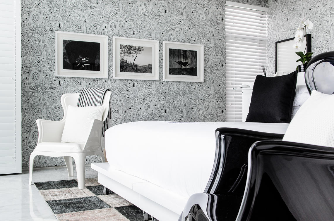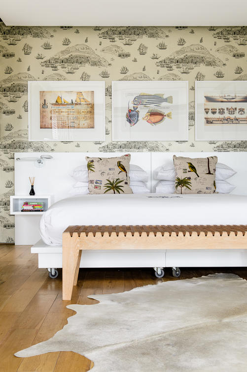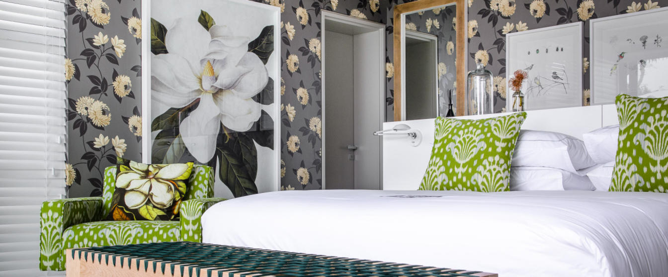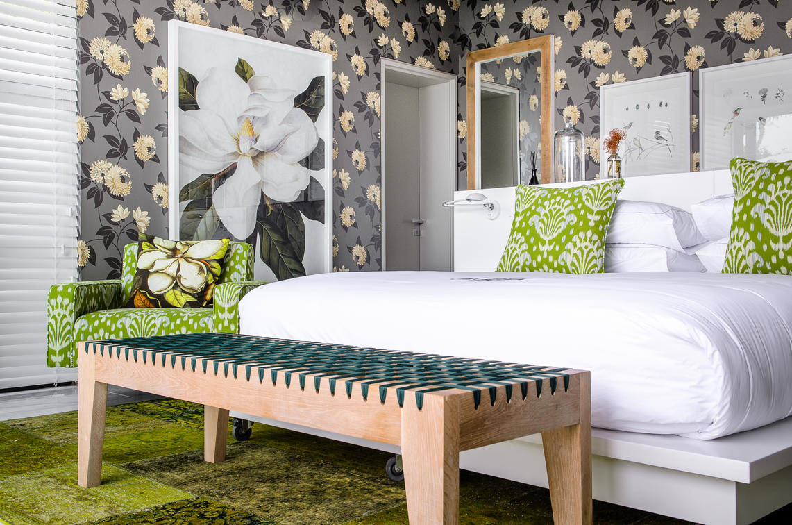 On the walls inside you’ll find pom poms, the flower theme continuing on through to the secret garden outside where wild plants frame the Mother City in the distance. Floor-to-ceiling glass sliding doors let you glimpse all from the comfort of your extra length king-size bed, as little sunbirds sing to you from their framed nests on the walls.
