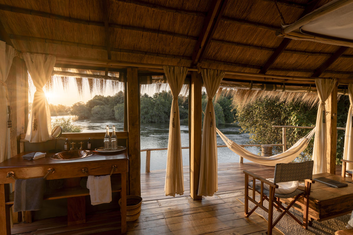 A glorious sunrise view is all yours at Sunrise Chalet 1, the only chalet on the southern side of Sindabezi Island. The other feature that sets it apart from Chalets 2, 3 and 4 is the large, modern outdoor bathtub. Covered by a blanket of bubbles and with a sundowner in hand, you can watch the Zambezi River drifting down to the Falls as the sky turns shades of pink, purple and orange. Sunrise Chalet 1 holds firm to its spot in the ‘romance department’ on Sindabezi Island.