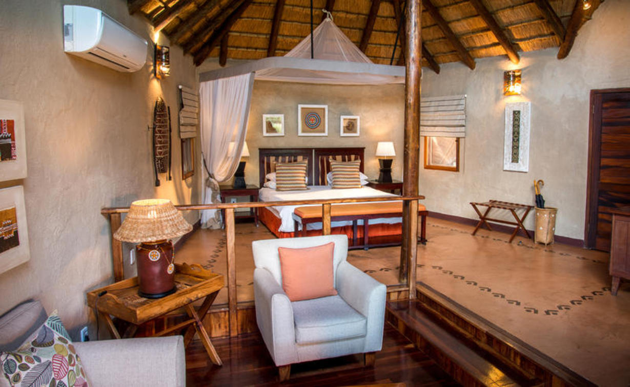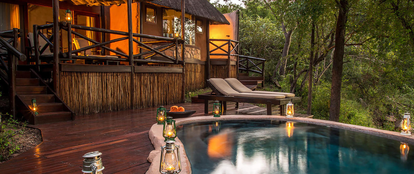The ultra luxurious Giant Eagle Owl and King Cheetah suites feature a separate bedroom, dining area, larger lounge, main bathroom with huge shareable bath, inside shower and outside shower, second bathroom and private pool with wooden deck.