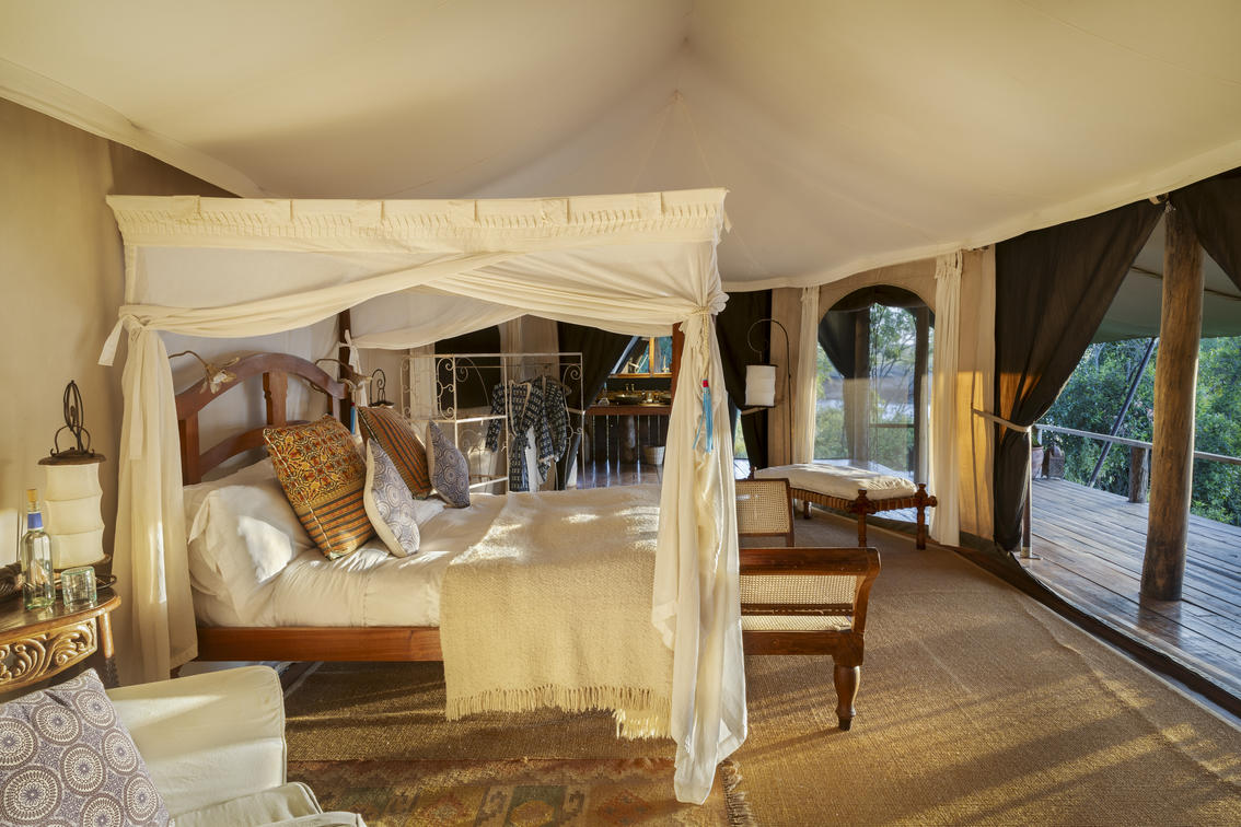 The tents are dotted along the riverbank, decked out in style with Zanzibar four-poster beds and open bathrooms overlooking pods of hippo.