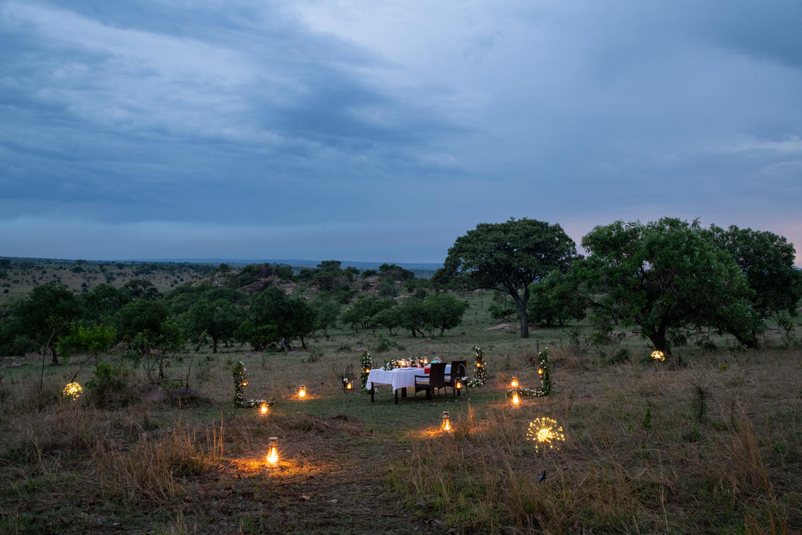 Experience an enchanting evening at Lemala Kuria Hills Lodge with a private dinner set beneath the breathtaking Serengeti night sky. Your table will be thoughtfully arranged in an intimate location, perhaps under the majestic Acacia tree or beside the shimmering pool, with softly glowing lanterns illuminating your path. The ambiance, adorned with candlelight, will evoke warmth and a bygone era as you dine under the brilliant stars above.