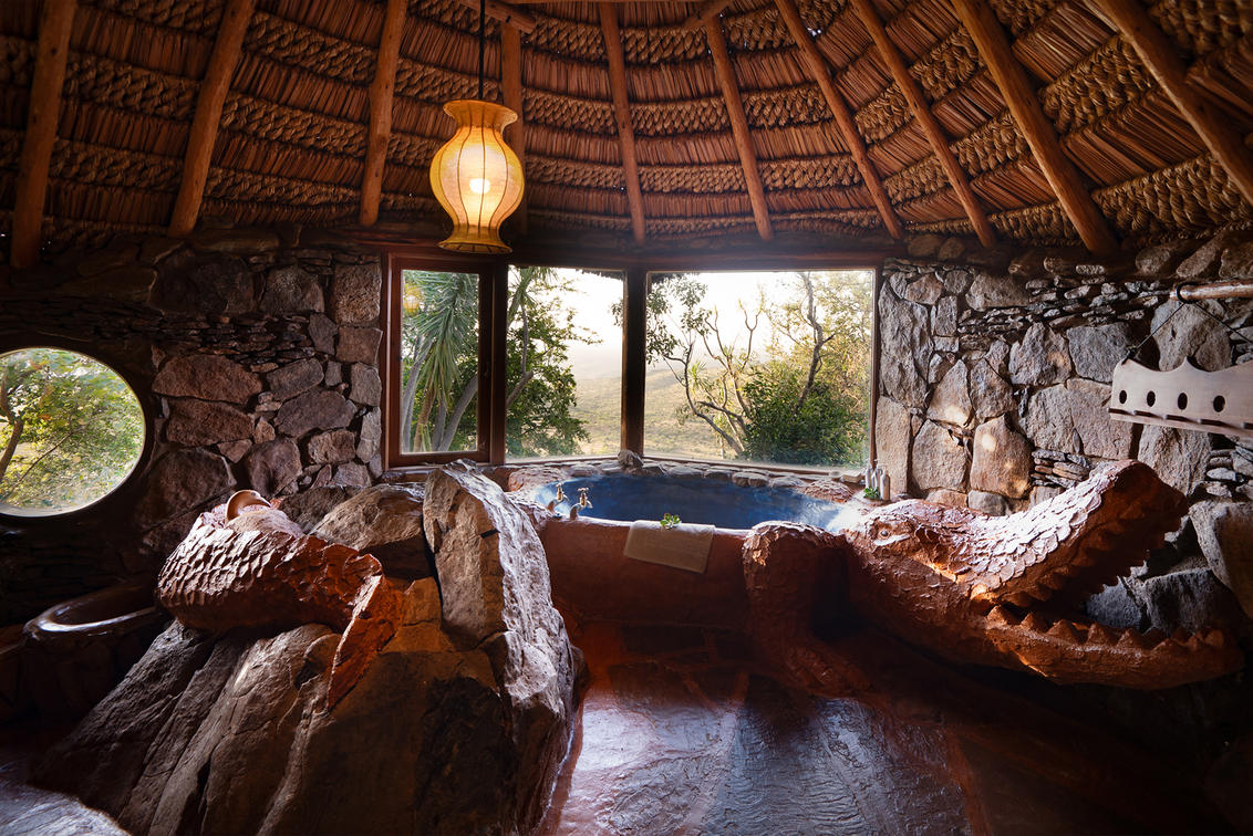 The “Crocodile “Cottage which is to the right of the main area facing the pool and ravine; very quirky and called “Crocodile” because the bath tub is actually built in to the back of a “fake” crocodile, complete with teeth and tail. This room sleeps two.