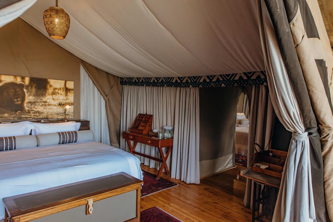 The 2-Bedroom Family canvas tent is custom-designed and sits on a slightly raised platform. It consists of two bedrooms, each with their own separate bathroom, dressing and washbasin areas;