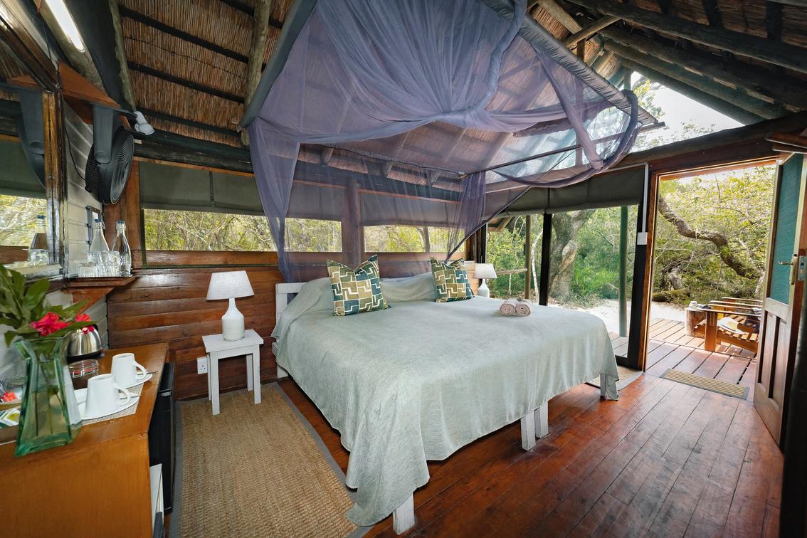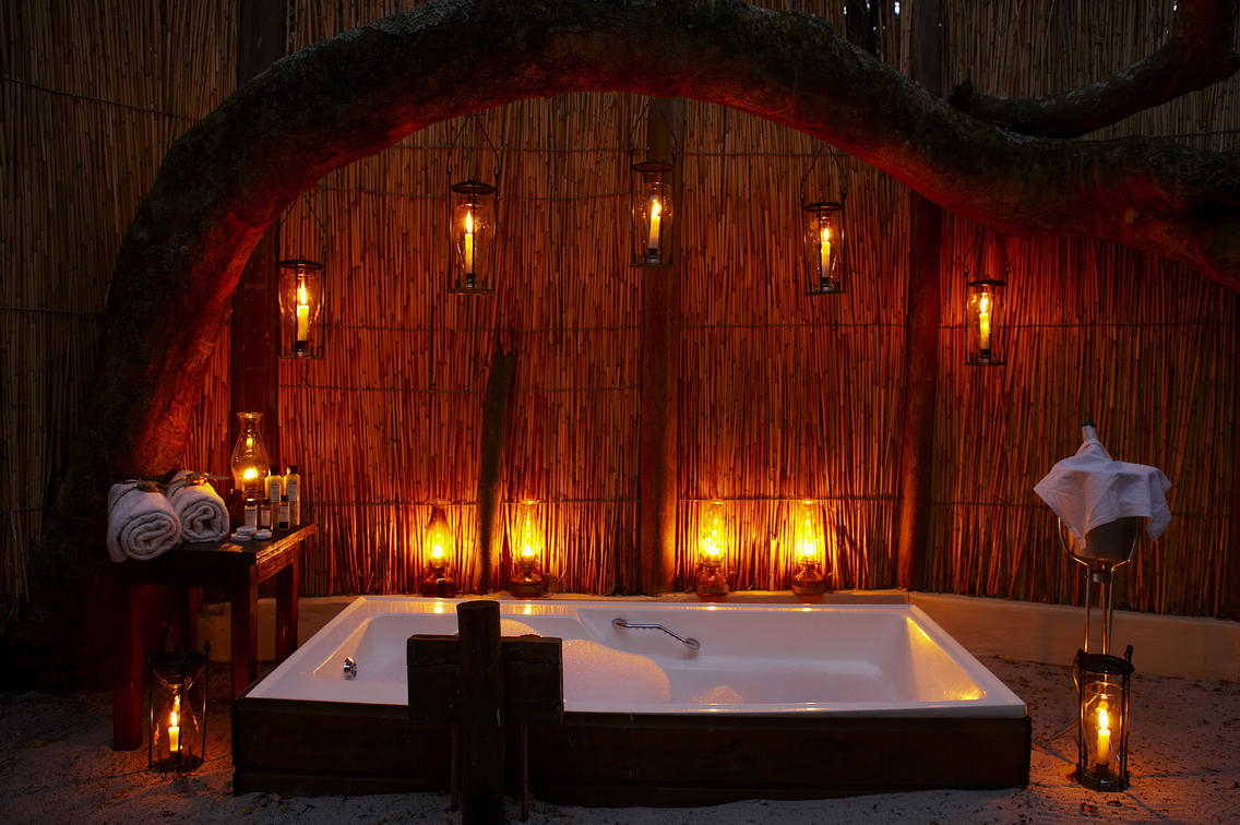 The rooms are constructed of wood, thatch and canvas each positioned to give total privacy. They are comfortably furnished with mosquito nets, Mini bar, fans and tea & coffee making facilities. A unique feature of each room is the romantic outside boma bathroom with bath and shower set in soft white sand under the forest canopy. Each room also has an indoor en-suite shower, toilet and basin.