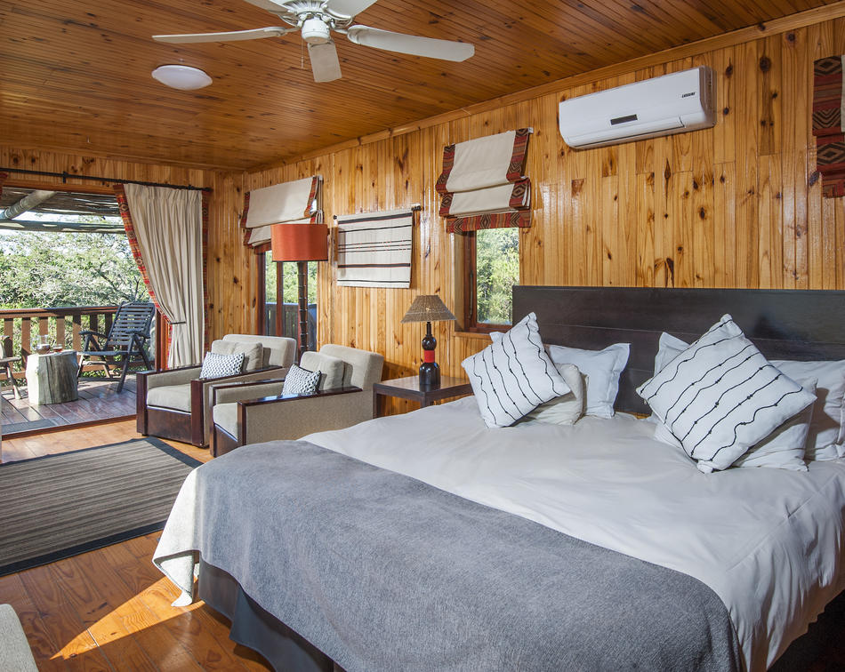 All bedrooms en-suite & air-conditioned. Living area, fireplace & viewing deck. Rate includes all meals, game drives & activities (excludes beverages and conservation & community levy). Note: Bookings for 2 or less people may be accommodated in a 1-bedroom chalet.
